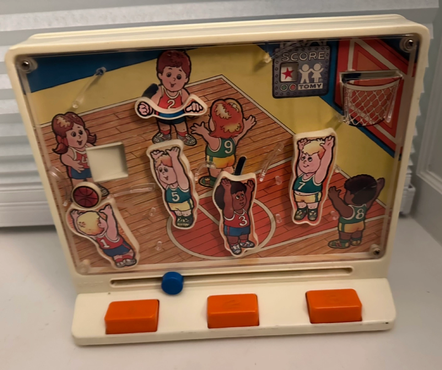 Tomy Shorty Shooters basketball game. Still works but scoring mechanism doesn’t anymore. No batteries required. Made in Hong Kong. Copyright 1978.