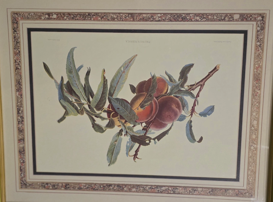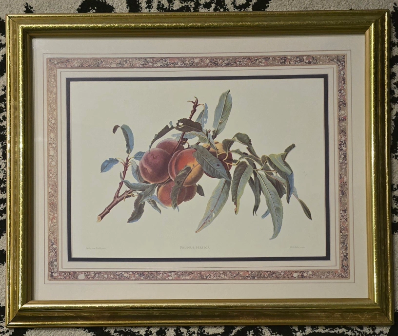 Framed print of peaches with a gold frame. Signed by Carlos von Riefel