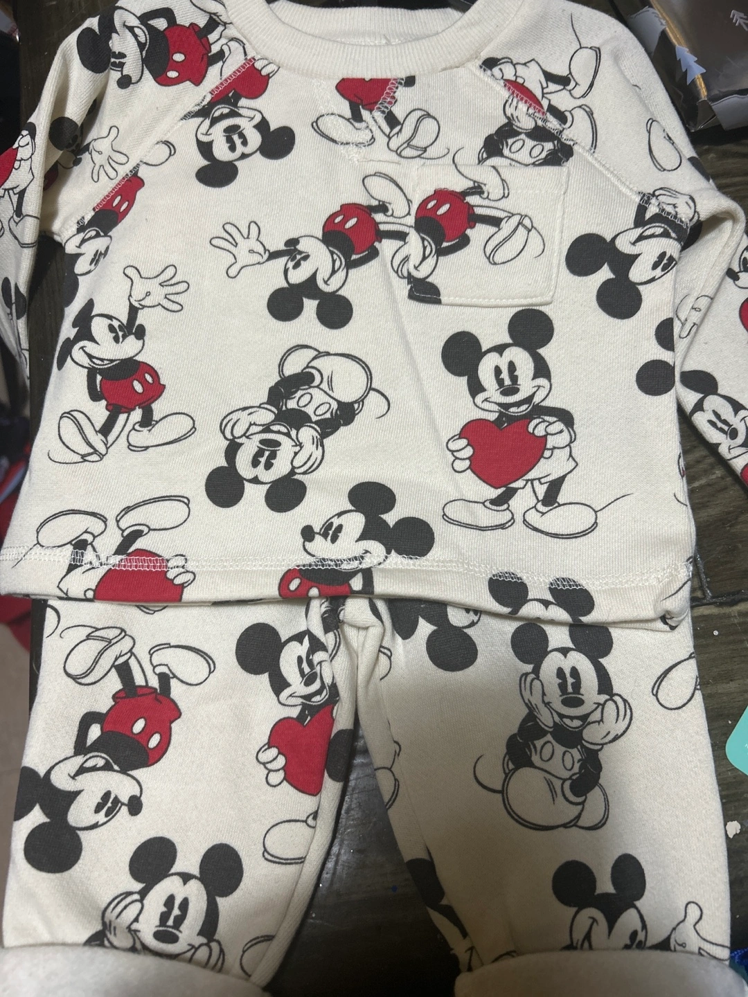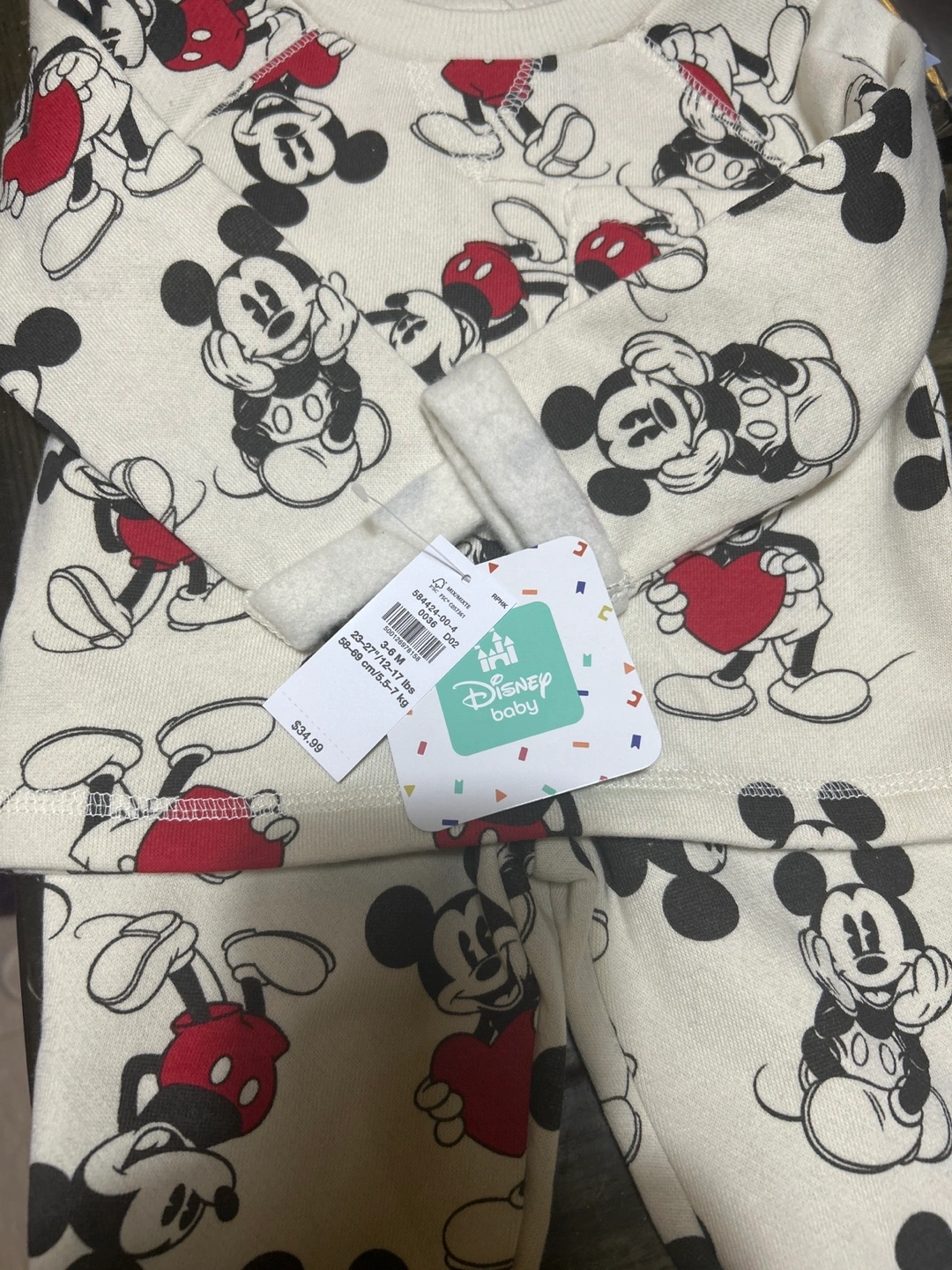 Two-piece set featuring a long-sleeved top and pants. Features Mickey Mouse print on a cream background.