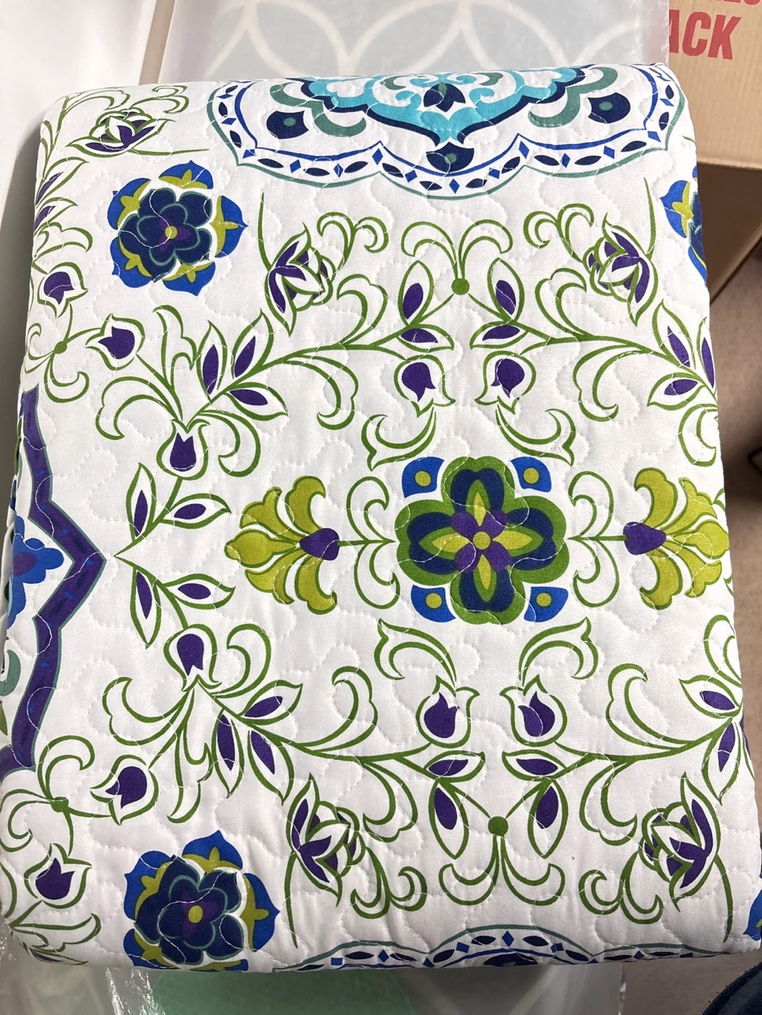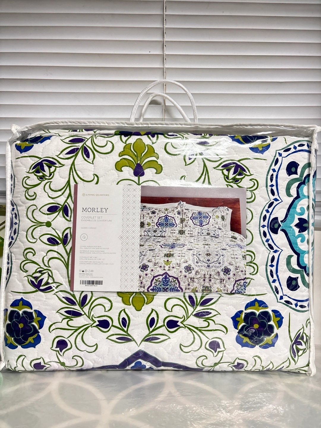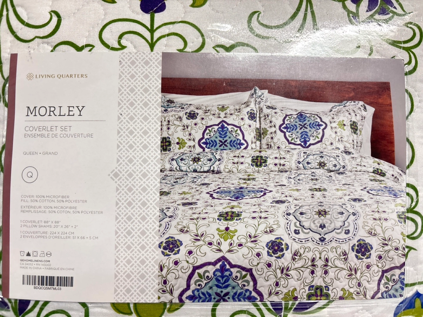 Queen size coverlet set, includes coverlet and two pillow shams. Floral pattern in blues, greens, and purples on a white background. 100% microfiber/ 50% polyester and fill 50% cotton.