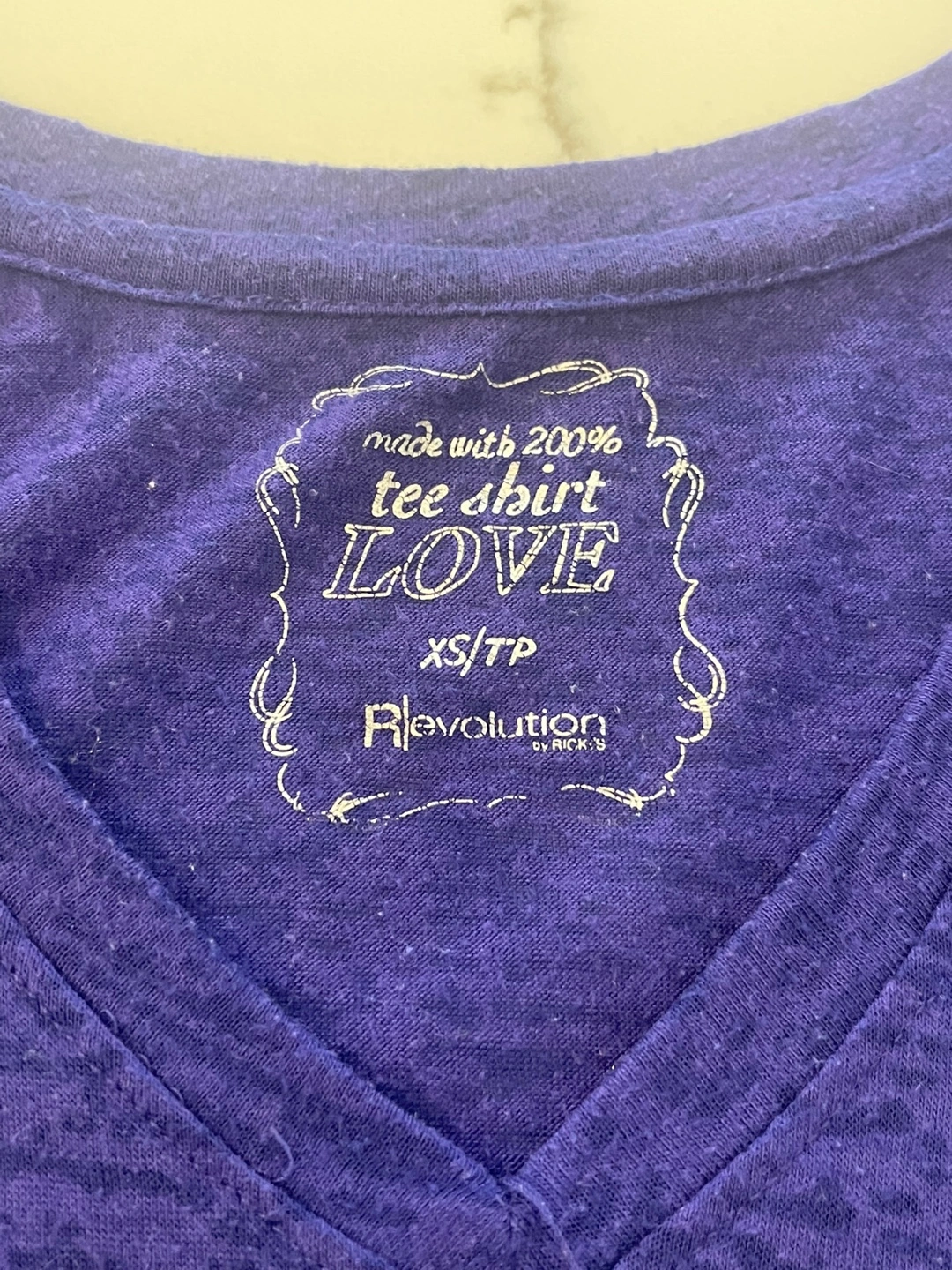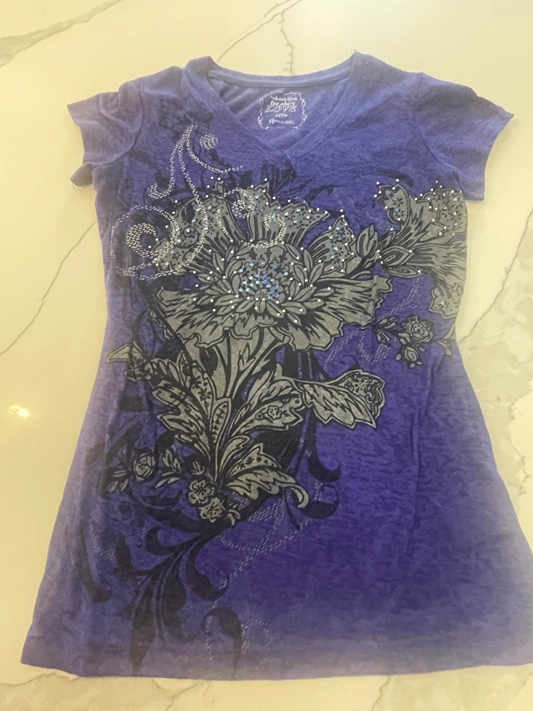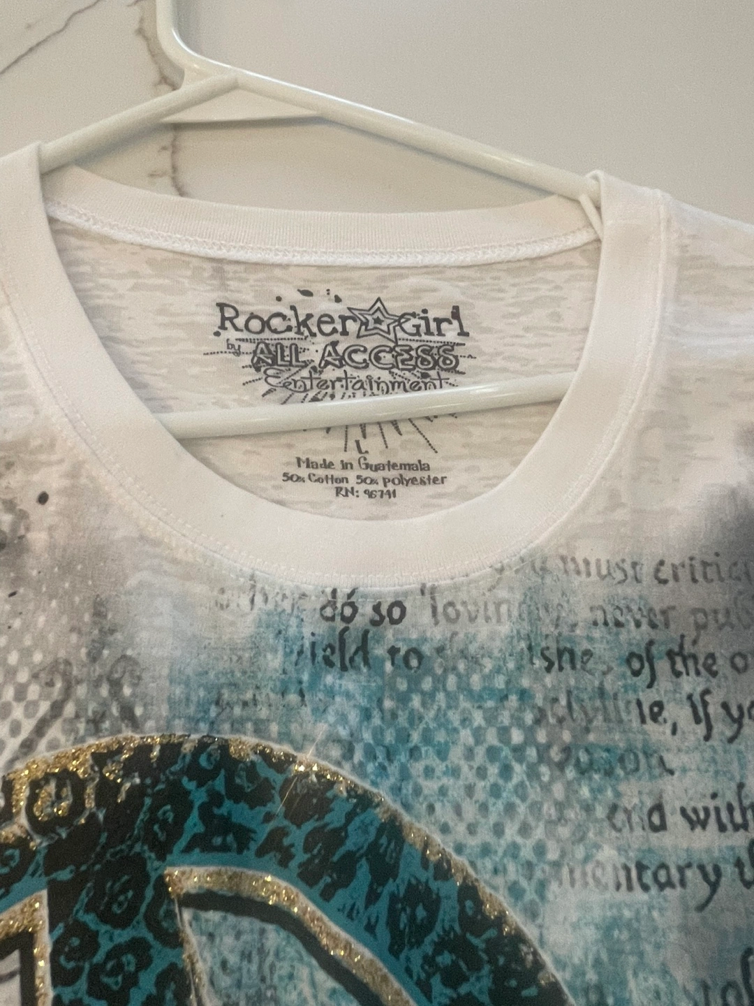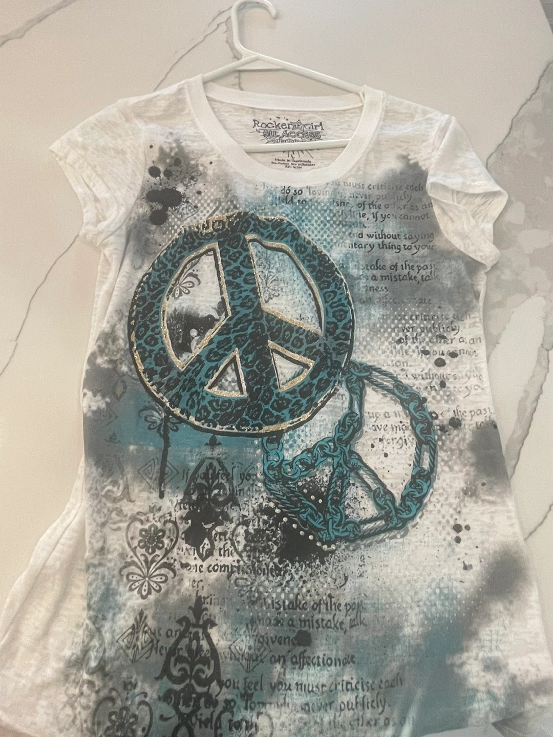 White T-shirt with palm trees and cityscapes print. V-neck, short sleeves, and a pocket on the front.