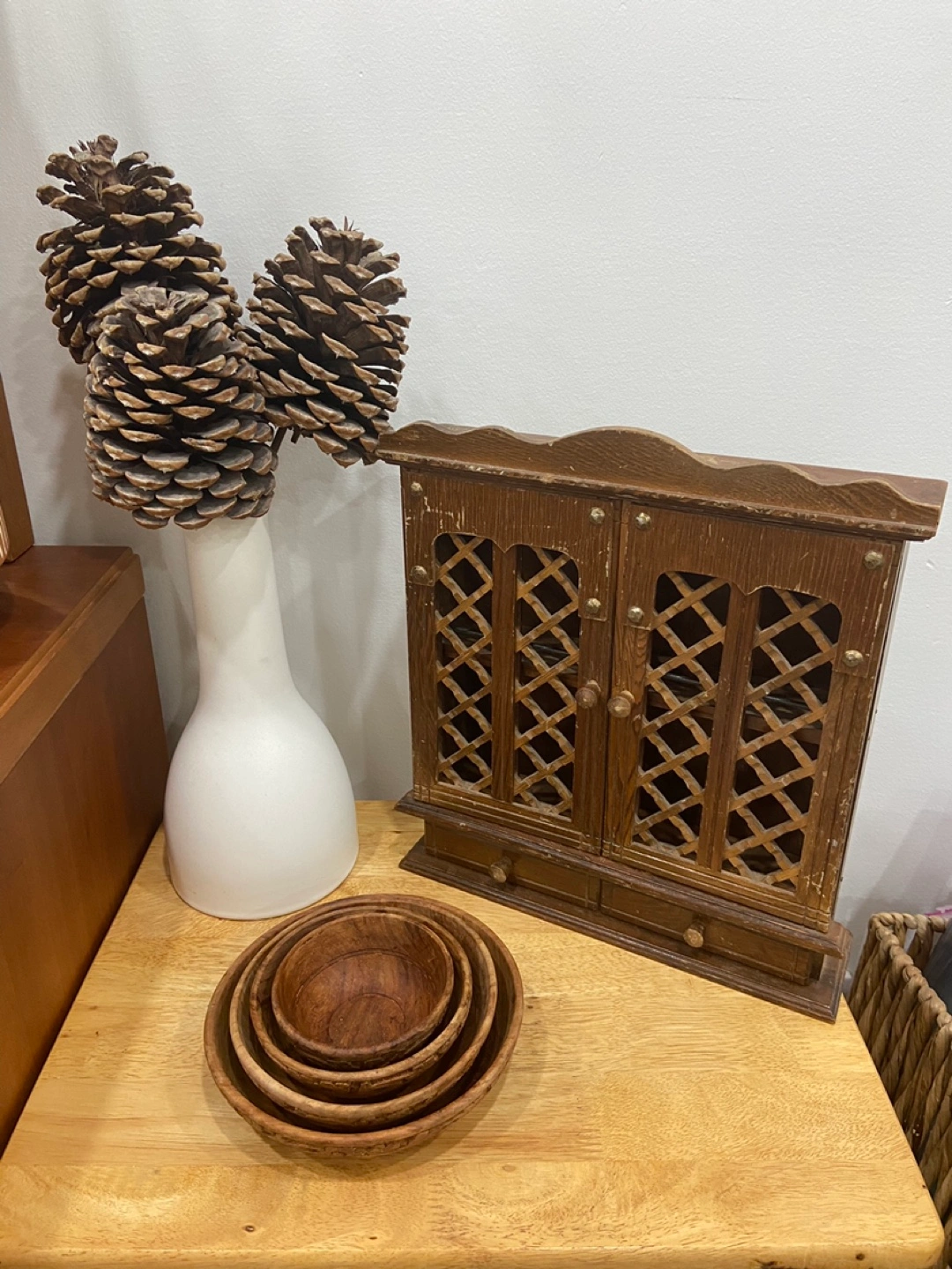 • Small Vintage Wooden Spice Rack circa 1970s, rustic used condition, two tier with two drawers below, the doors have a lattice design. Perfect for shelf or counter decor, or on the wall.