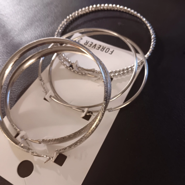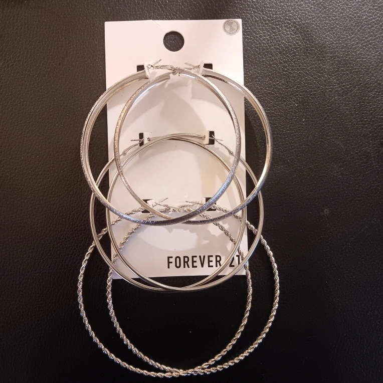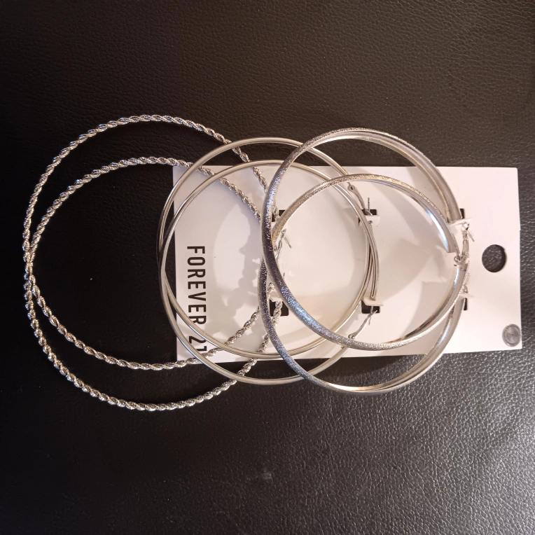 Set of three pierced Xtra large silver plated hoop earrings. one plain hoops, one textured hoop, and one rope chain hoop. ABC= Always Be Cute!