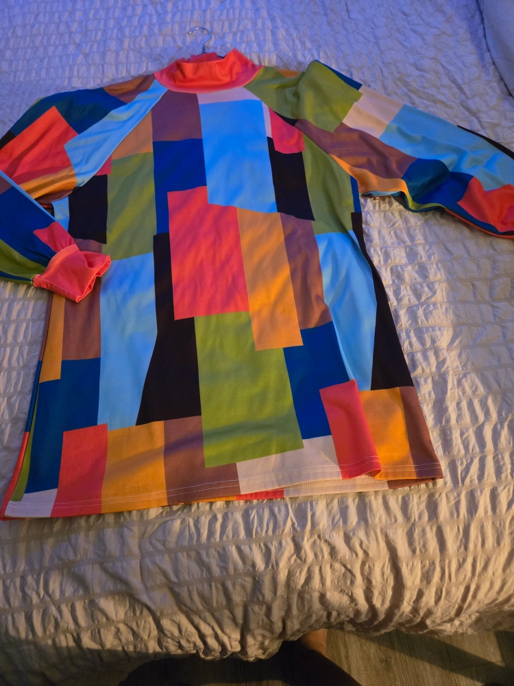 Long-sleeve shirt with a geometric pattern in various colours. Mock neck. Never wore it. Gained weight after hysterectomy ๐