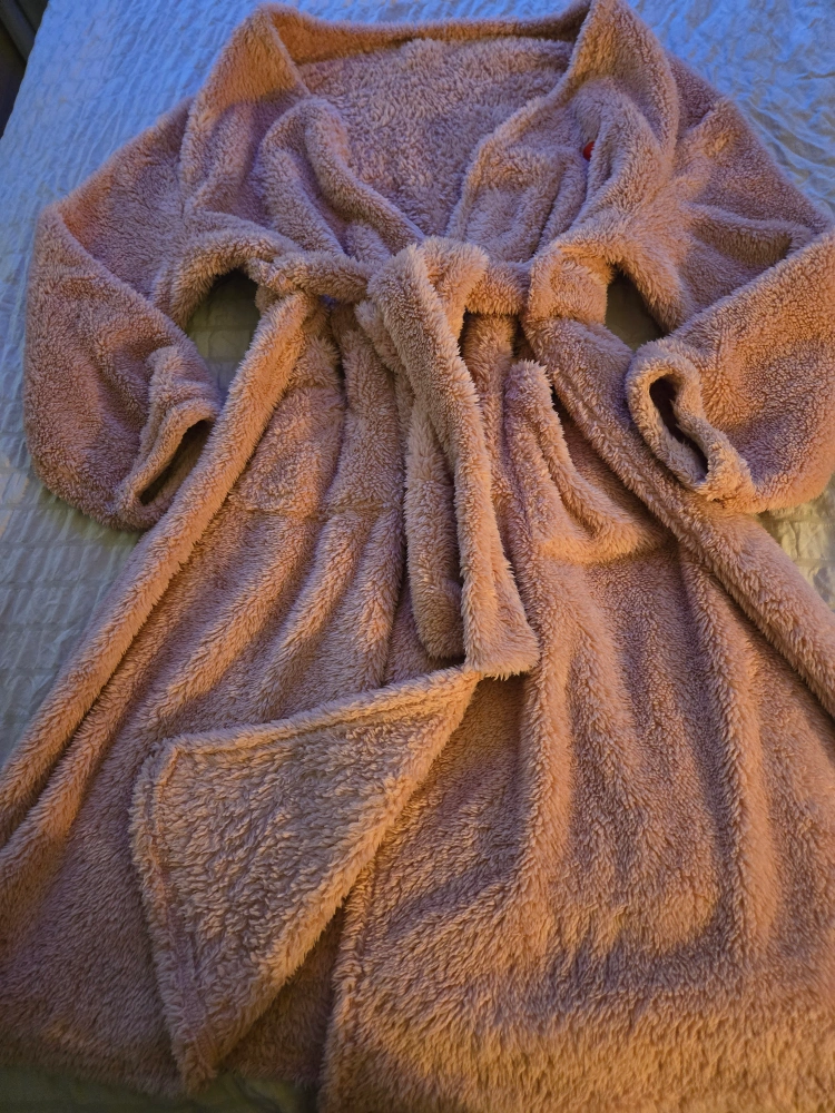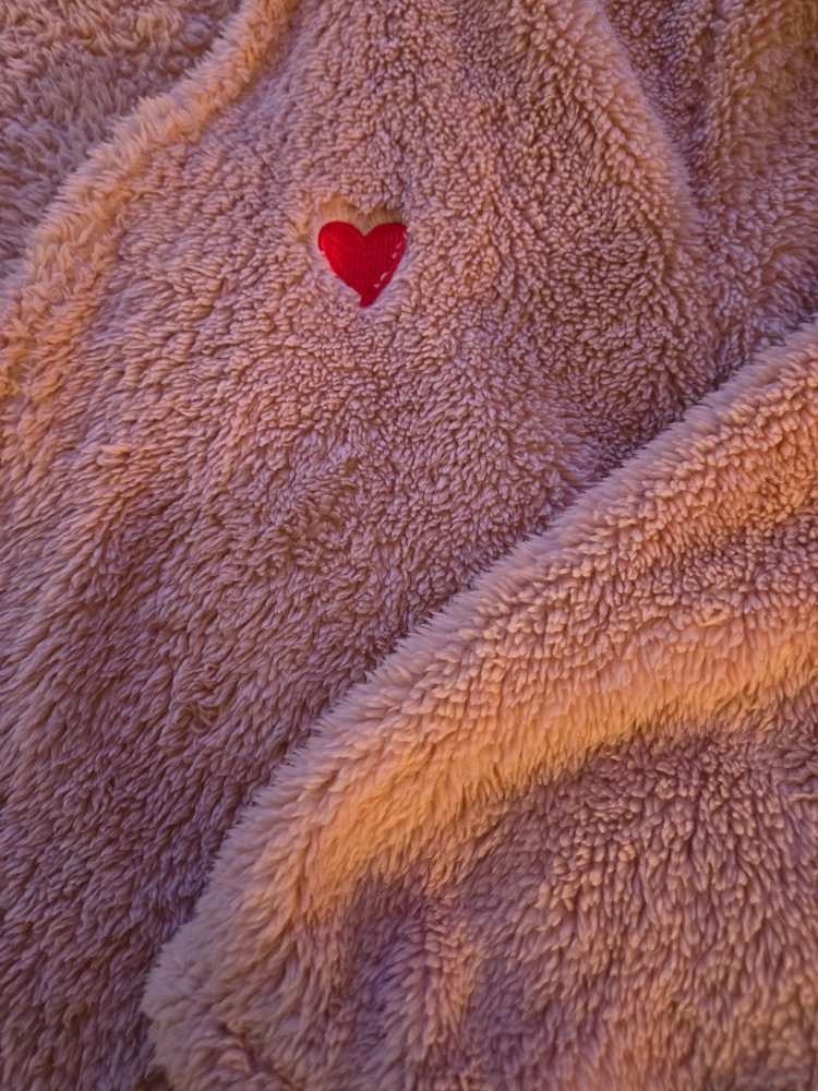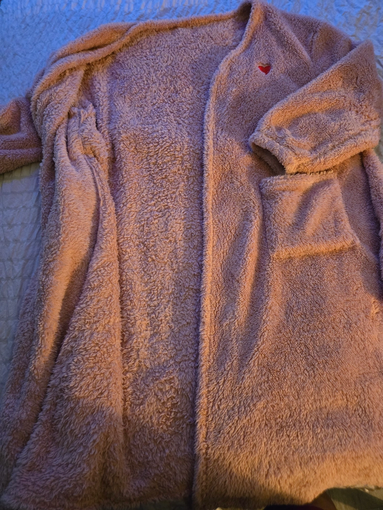 988Soft pink fleece robe with a heart detail on the front. Has a tie at the waist and two pockets. Perfect for lounging around the house or layering on a cold winter's night
