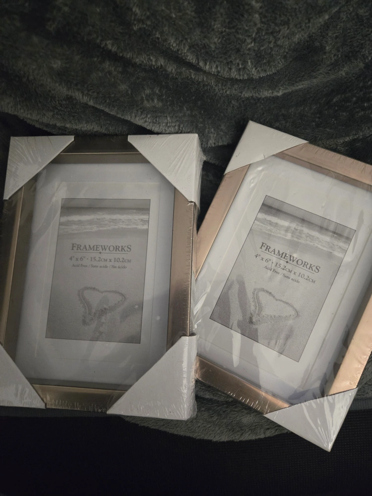 Set of 2 Frameworks picture frames. Gold-coloured frames with white mats. 4 x 6 inches in size. Acid-free, shatter-resistant glass.