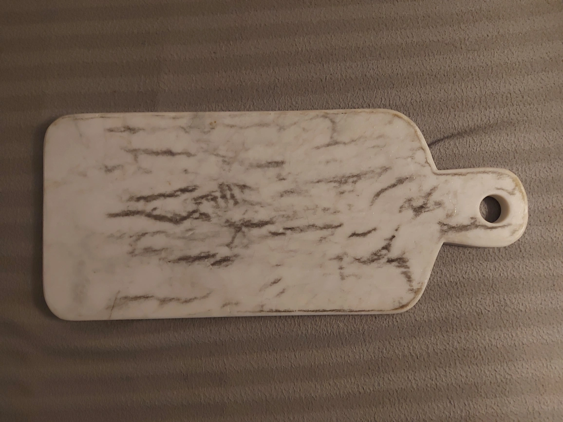 White marble cutting board with grey veins. 14 inches long, 6 inches wide. Comes with a handle and non-slip rubber feet. Pick up at Gerrard and Greenwood