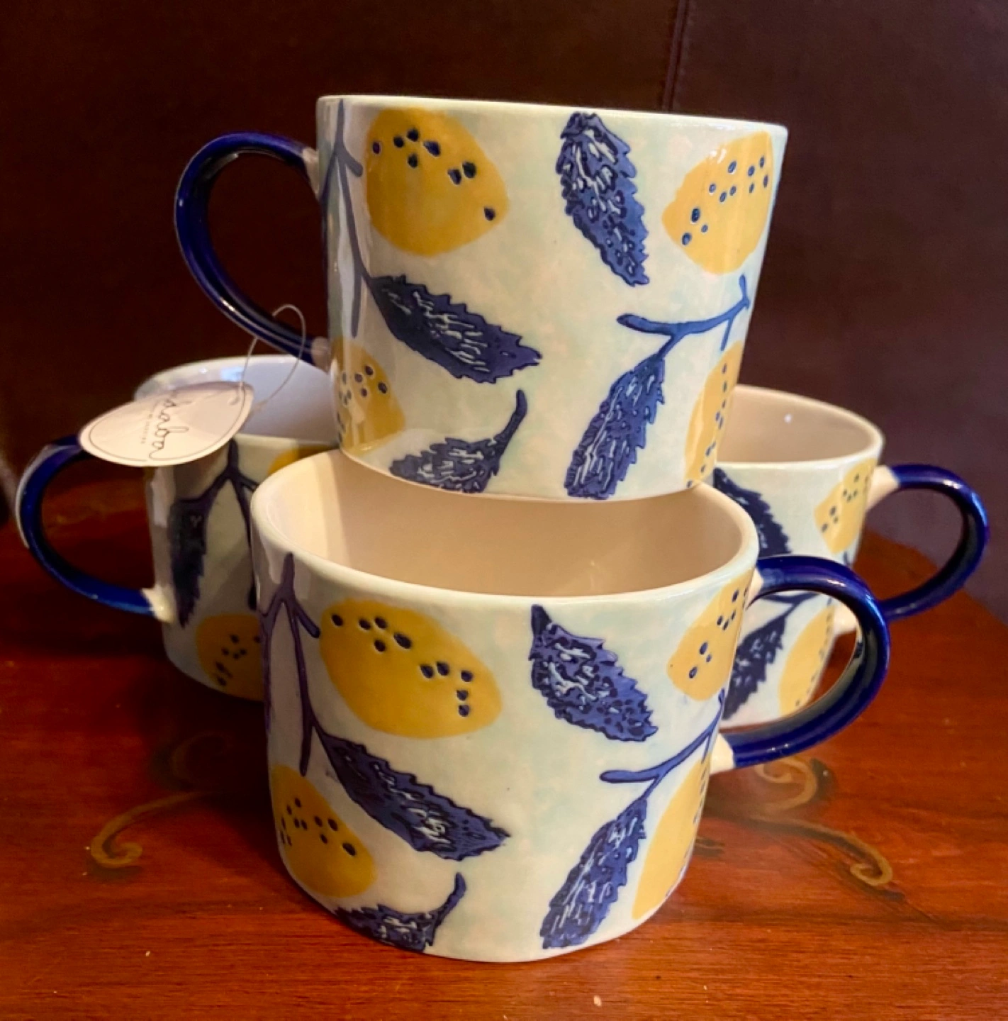 Set of 4 handmade ceramic mugs with blue handles and a lemon and leaf design. Microwave and dishwasher safe.
