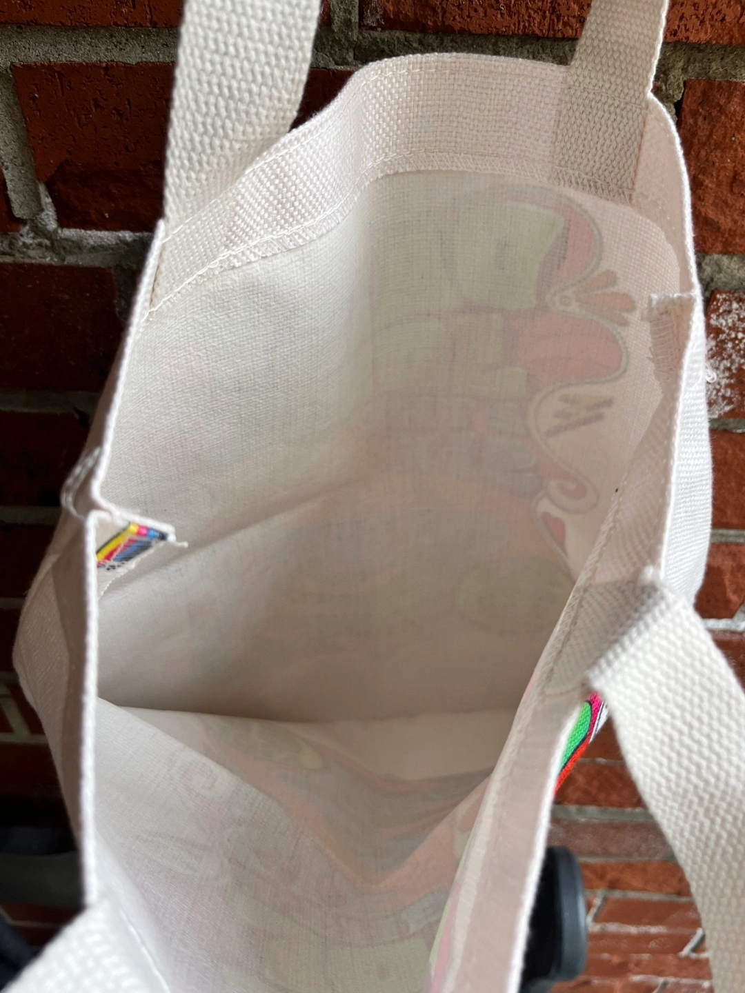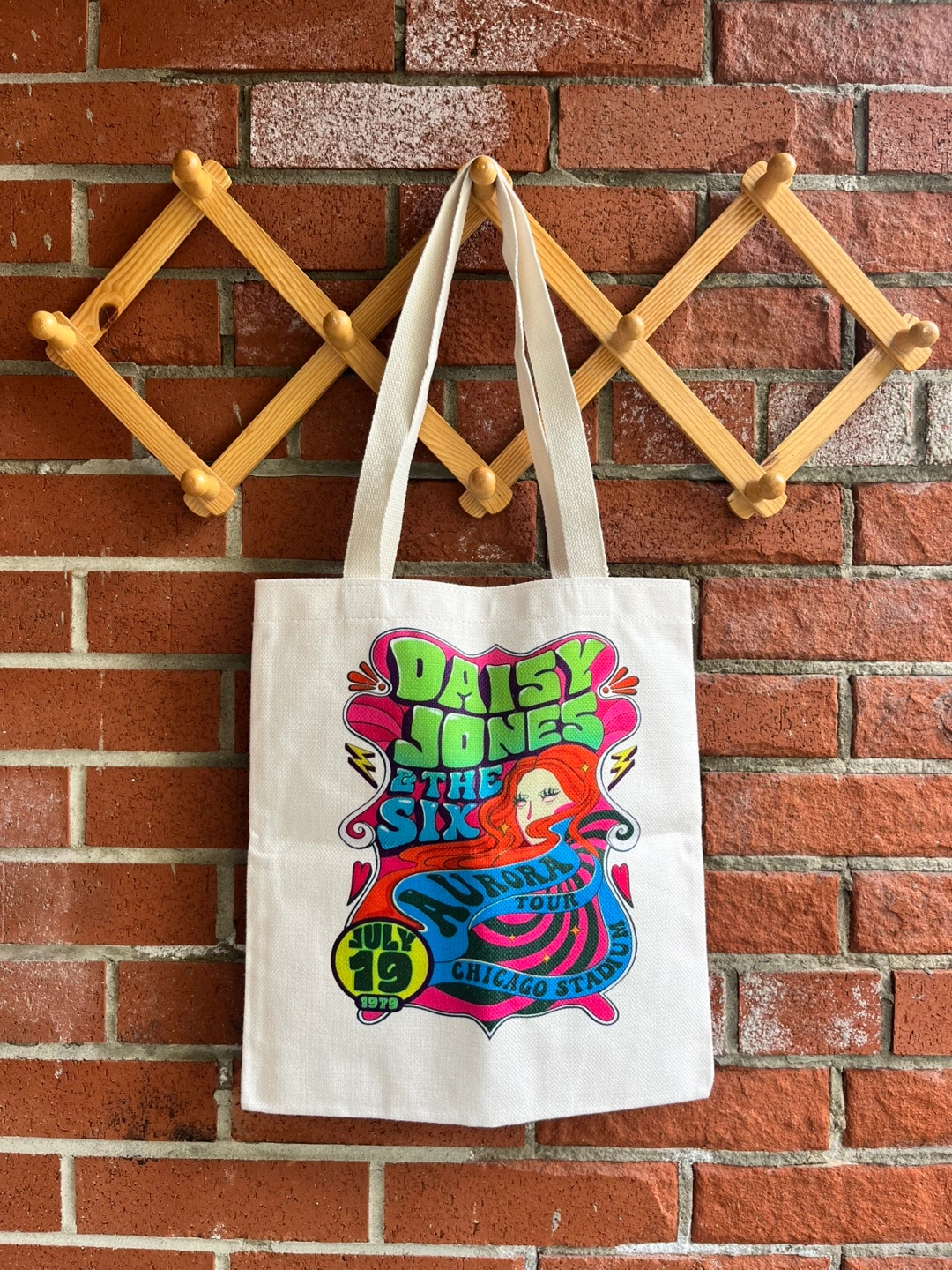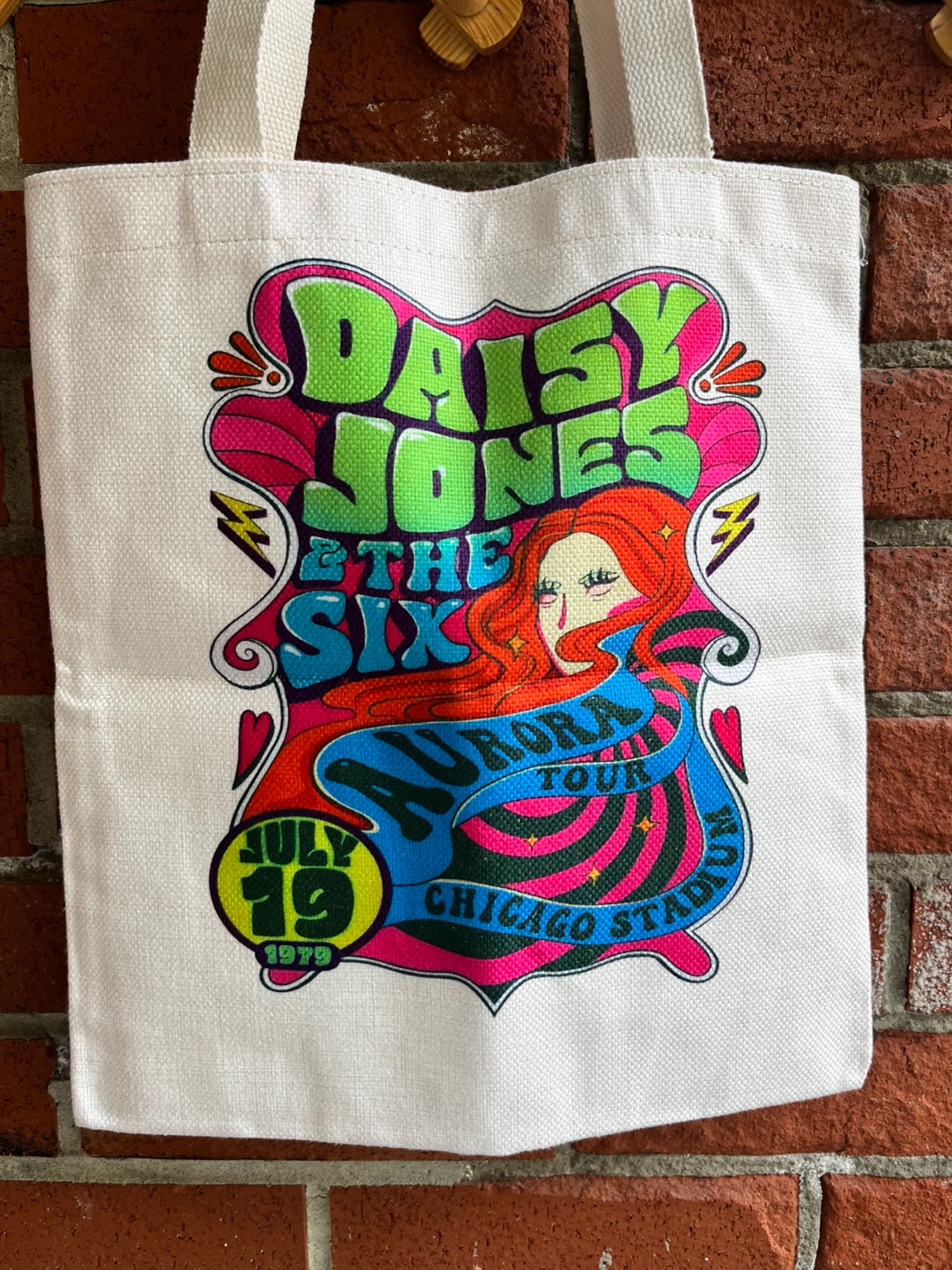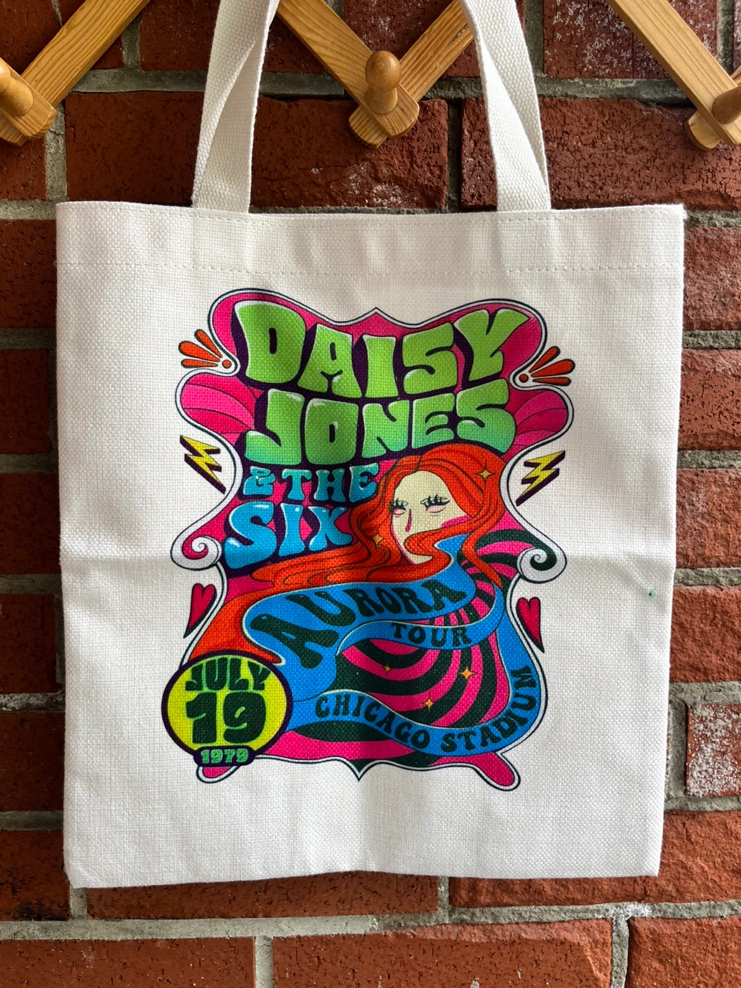Tote bag with Daisy Jones & The Six graphic. White canvas with a colourful graphic from the 1970s.