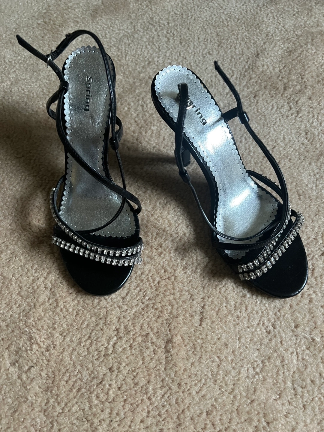Black strappy heels with rhinestones. Size 7. 4” heel Smoke free home Pick up near Glenanna Road and Hwy 2 If ad is still up it’s available