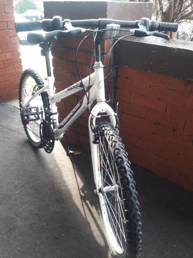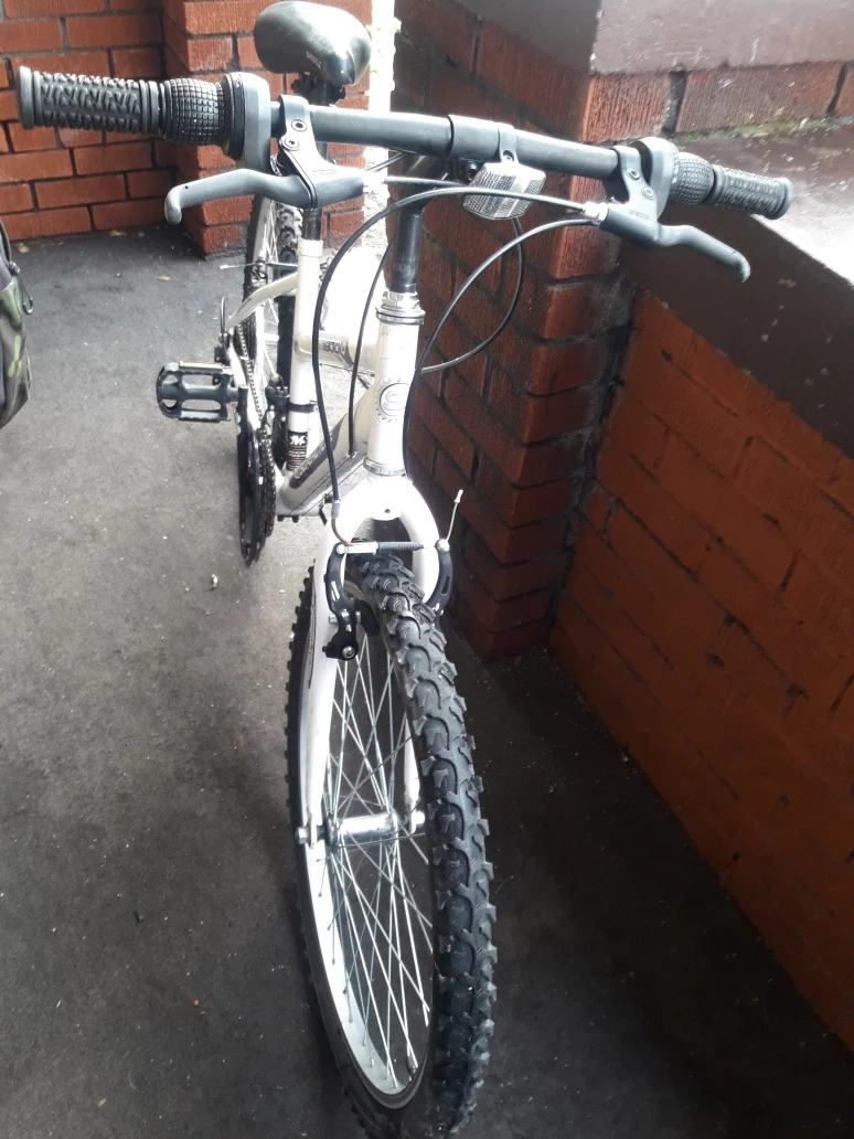 White mountain bike with purple accents. 24-inch wheels, hand brakes, and a front suspension along with free manual Air pump plus extra tube. Tires like new