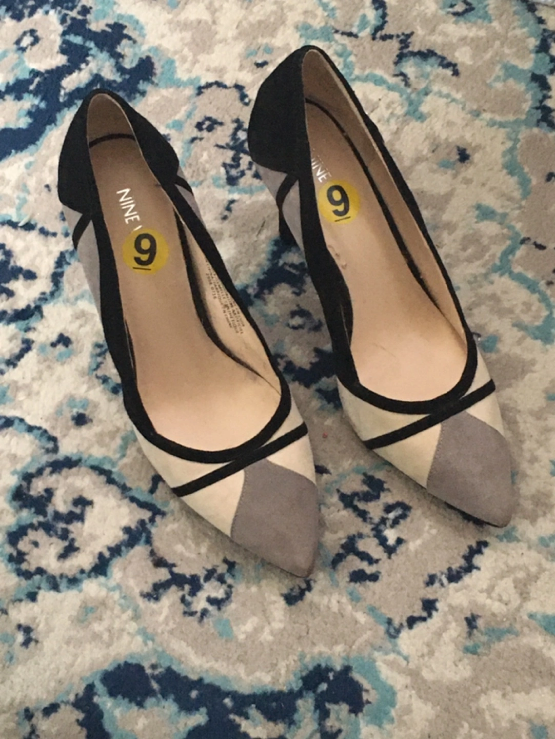 These have been sitting in my closet since 2016–unworn with price tag!! Hopefully someone else has better use for these Nine West Leather upper heels. Grey, black, and cream. Size 9M. 4 inch heel.