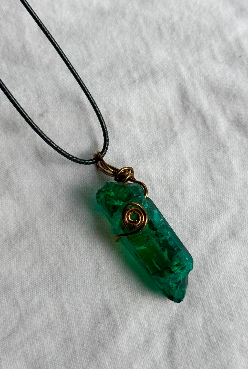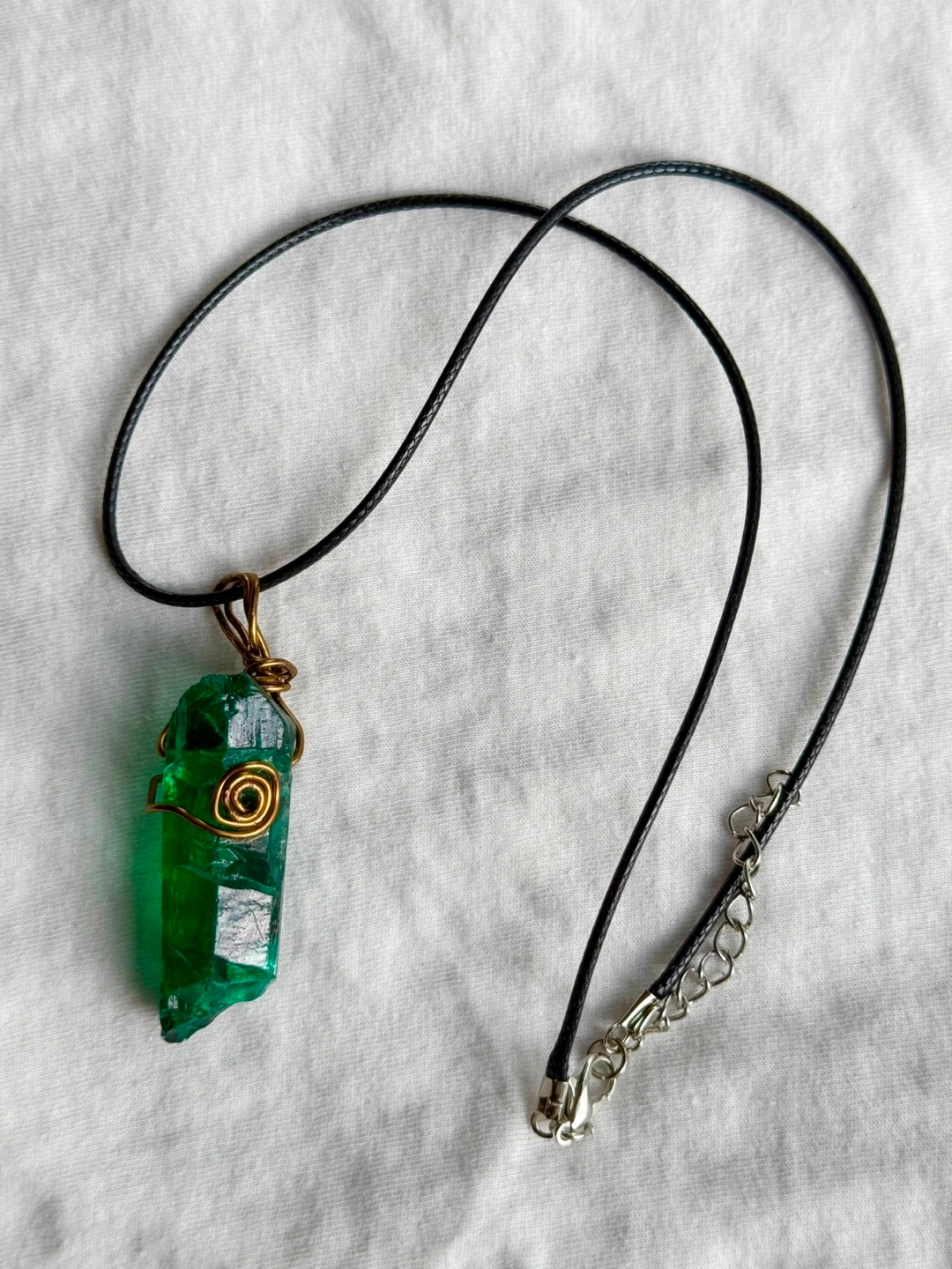 Green crystal pendant on a black cord necklace. Wrapped in bronze wire.