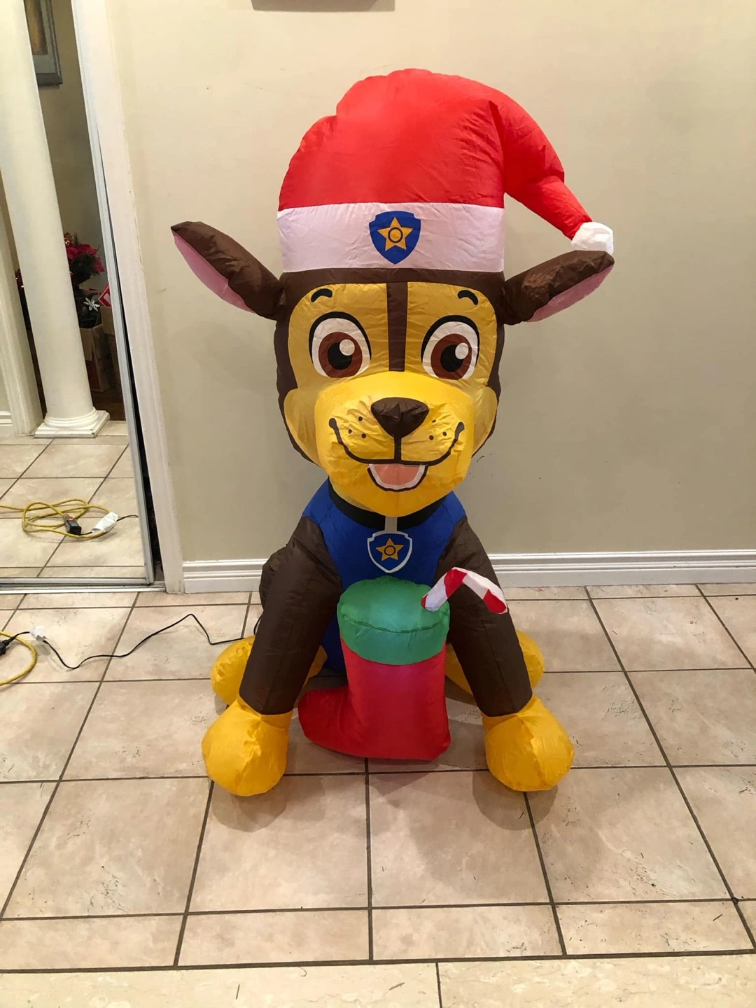 Inflatable Christmas decoration. Chase wearing a Santa hat and holding a stocking