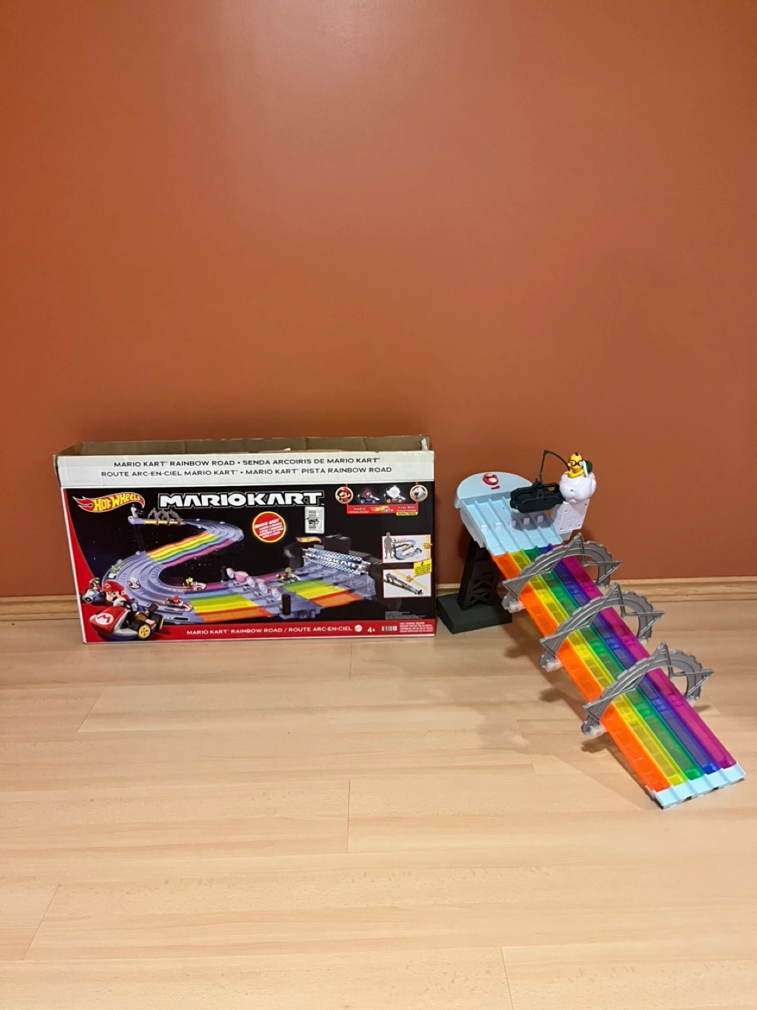 Mario Kart rainbow track set. Brand new, set it up and grand kids used it for twenty minutes. Totally complete with all pieces and cars.