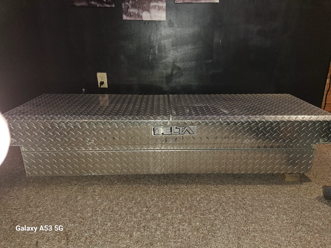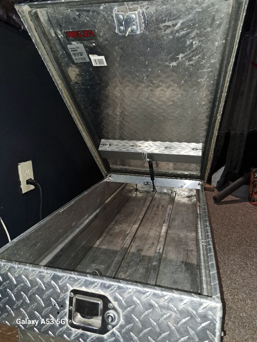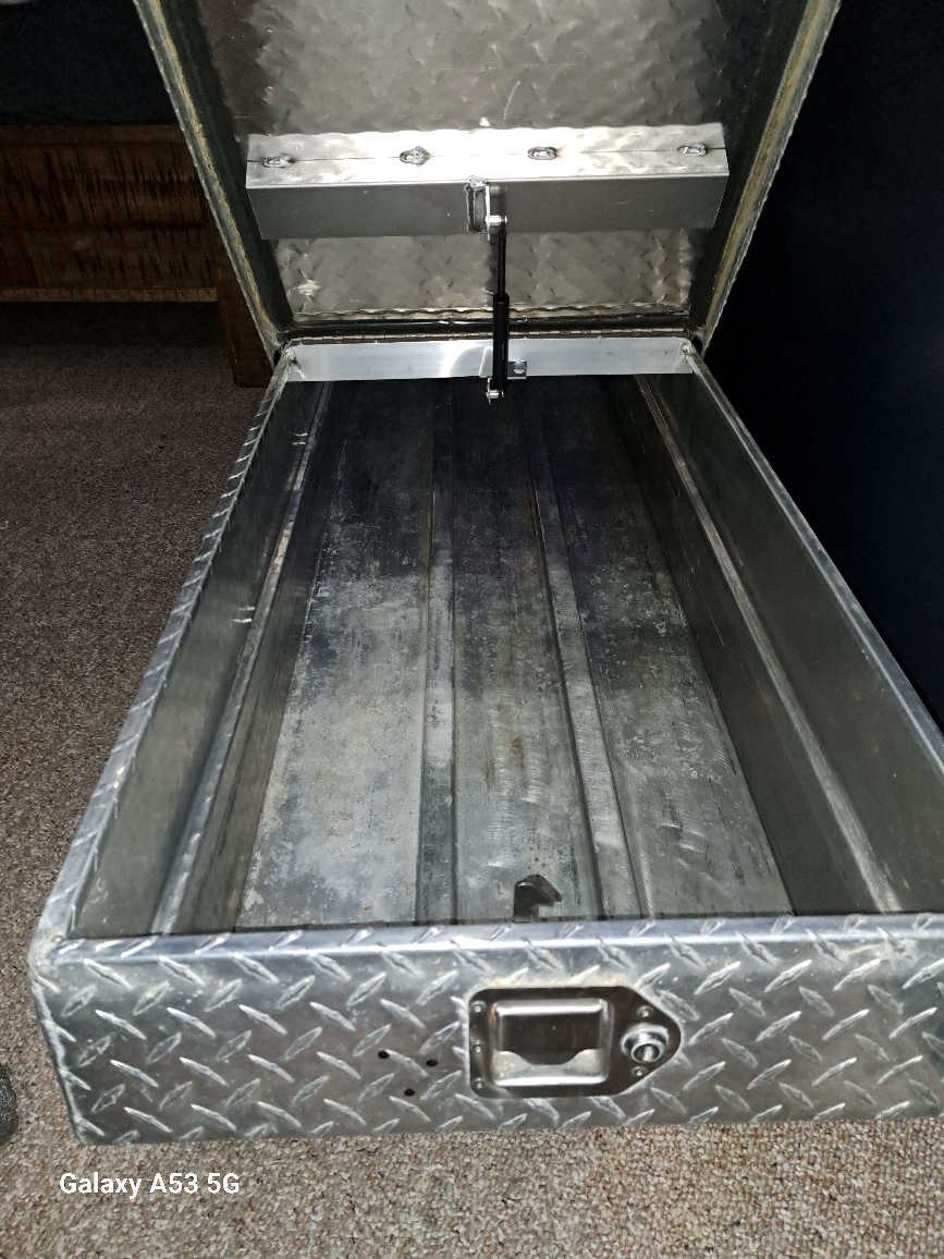 Aluminum toolbox, diamond plate design, hinges and lock work. Two lids, one opens to reveal a smaller compartment. no keys but can easily replace them