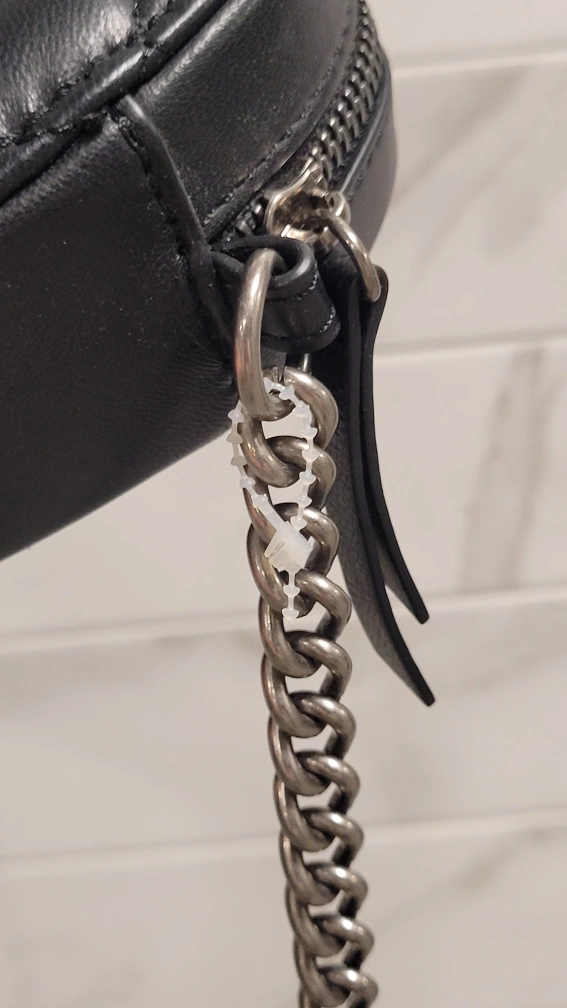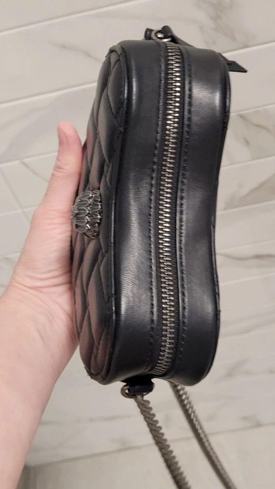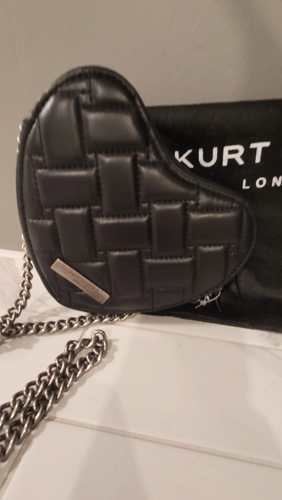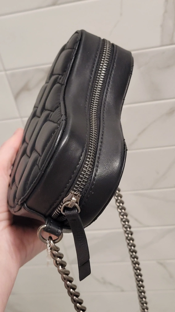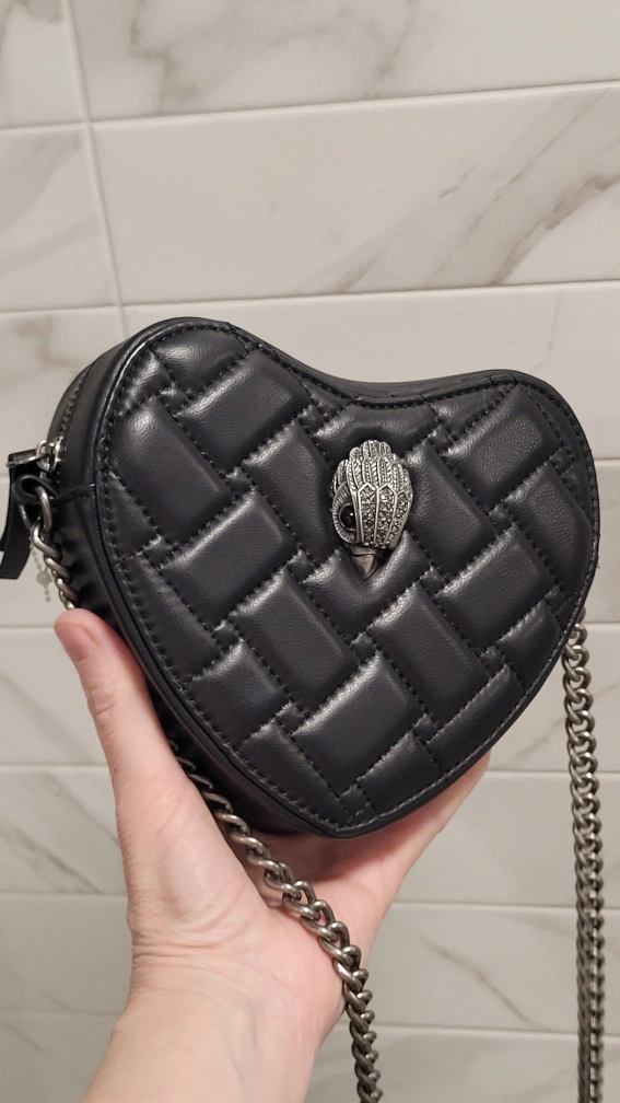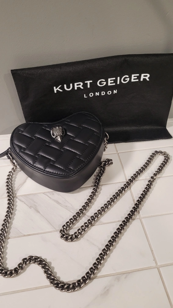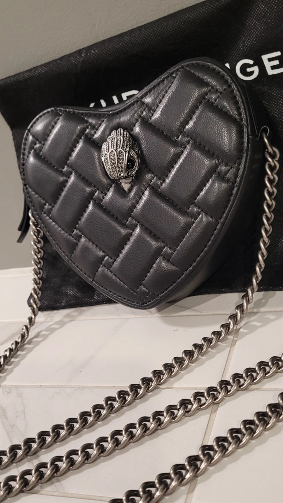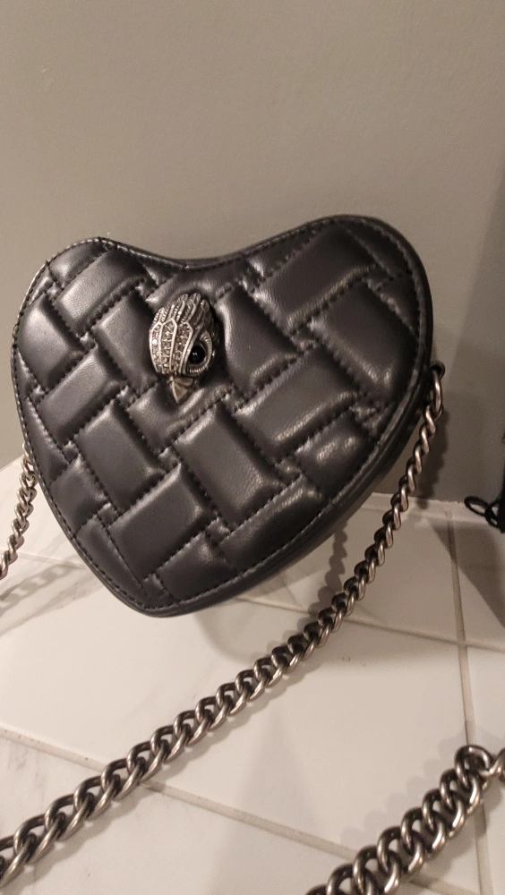 Black quilted heart-shaped bag with chain strap and a silver bird embellishment. Comes with dust bag.