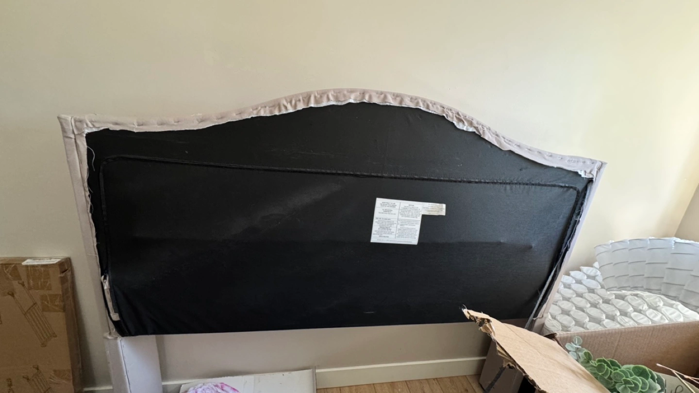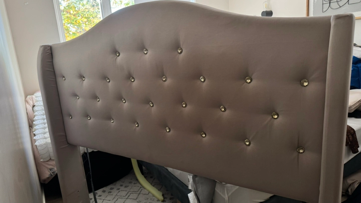 Queen-sized headboard with a curved top. It has a beige fabric covering with crystal-like buttons. The headboard is in good condition, with no tears or stains. It is easy to attach to a bed frame.
