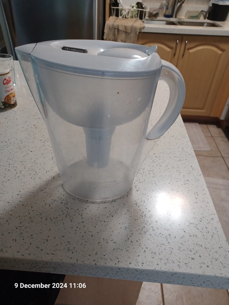 Water filter pitcher with 4 filter cartridges. Includes a filter and a lid. Great for making clean-tasting water.