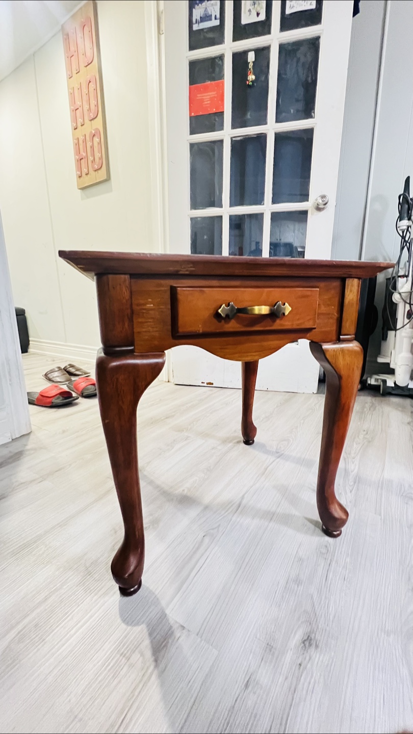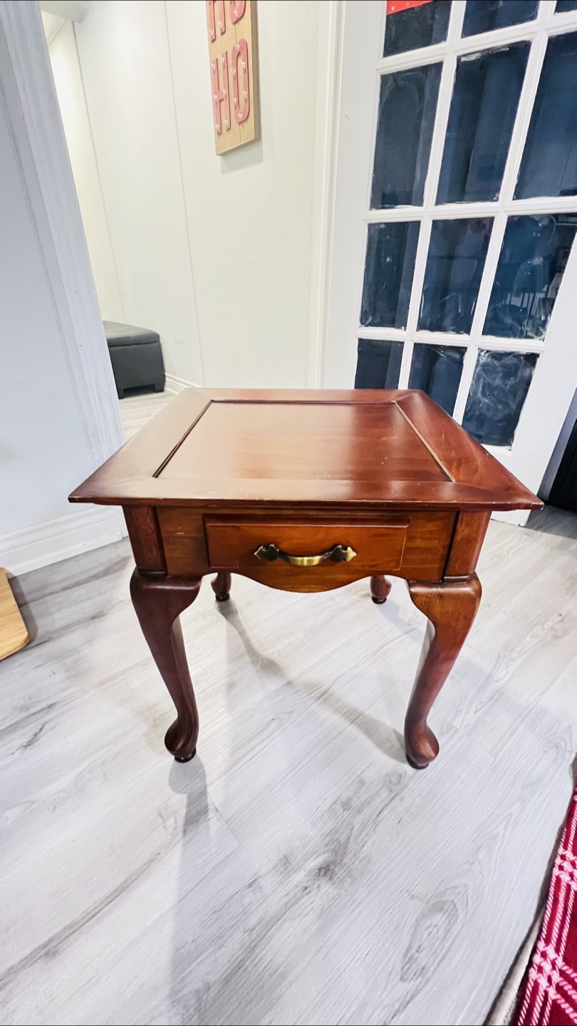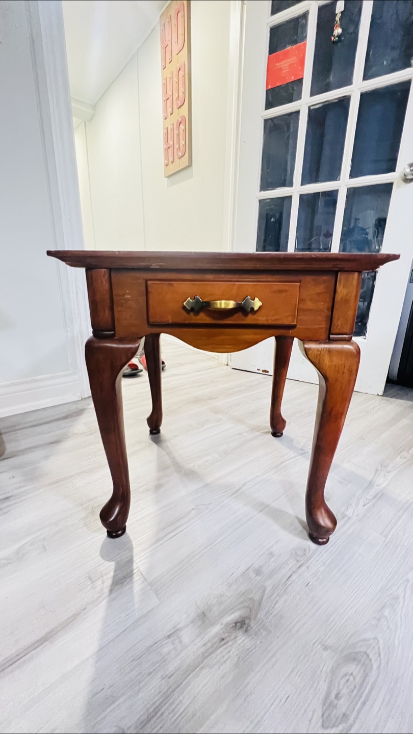 Small wooden end table with a drawer and cabriole legs. Solid wood construction. Good condition with some minor wear and tear.