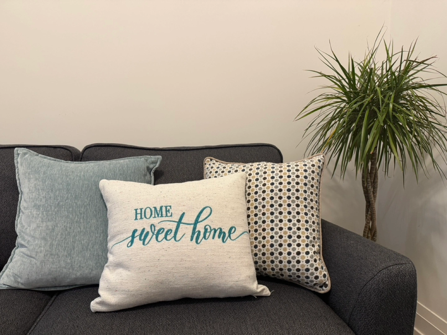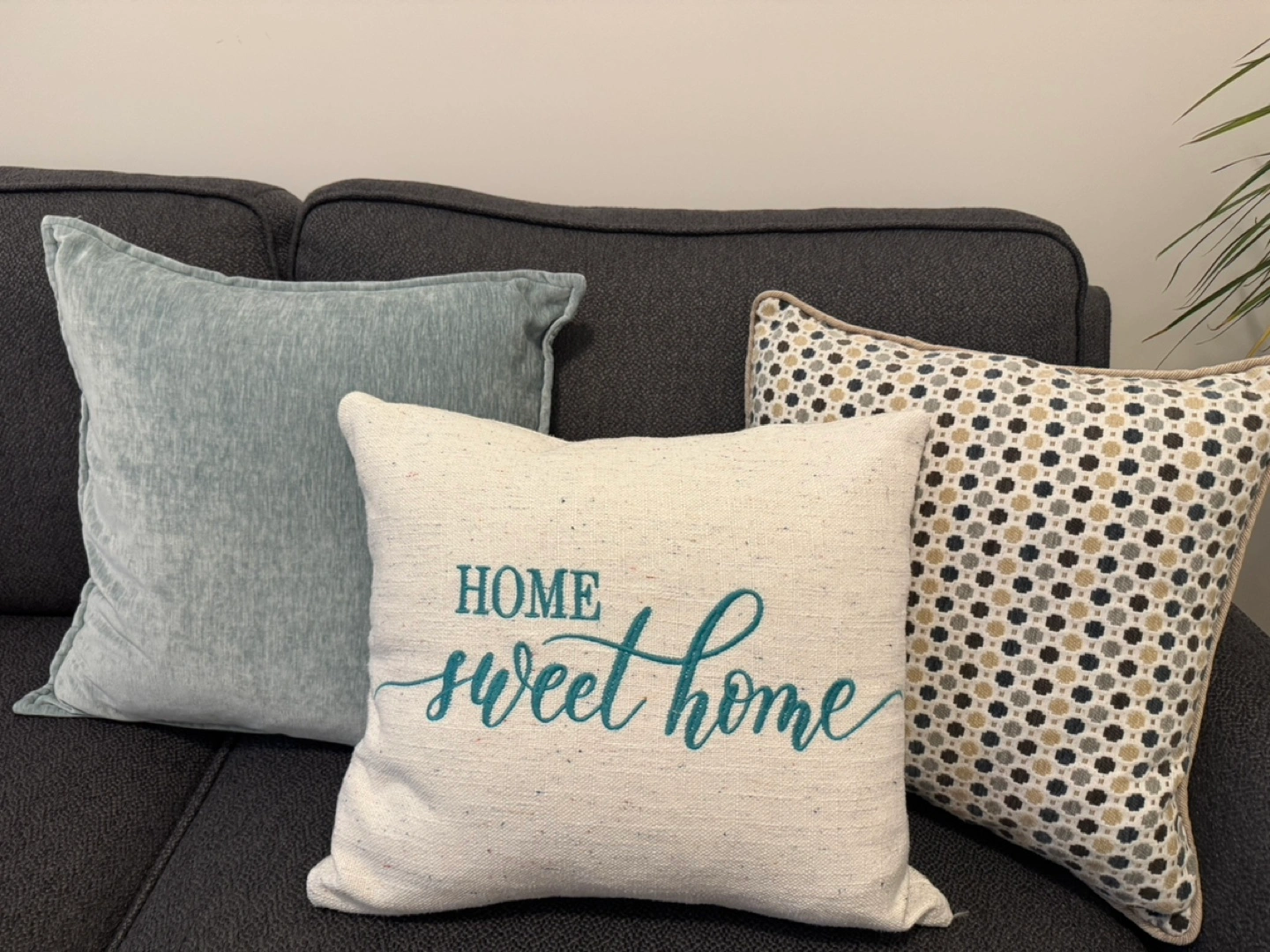 Set of 3 decorative throw pillows. Two are solid coloured and one has a patterned fabric. The patterned pillow has a 'home sweet home' inscription. They are all in good condition.