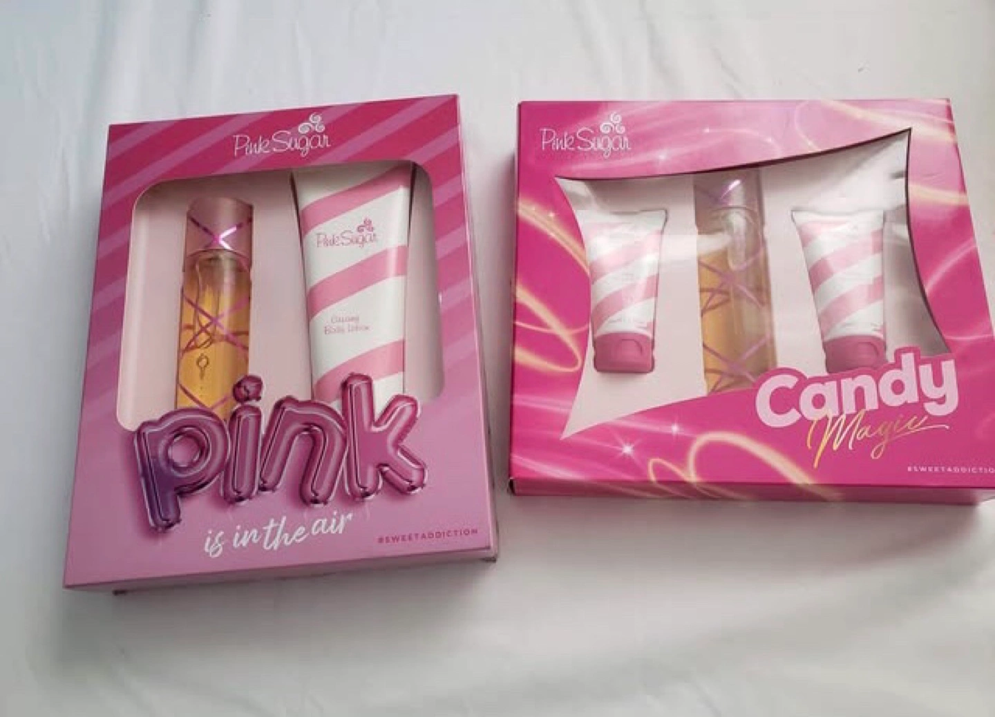 Two Pink Sugar gift sets. One set includes a perfume and body lotion. The other set includes a perfume and two body lotions.