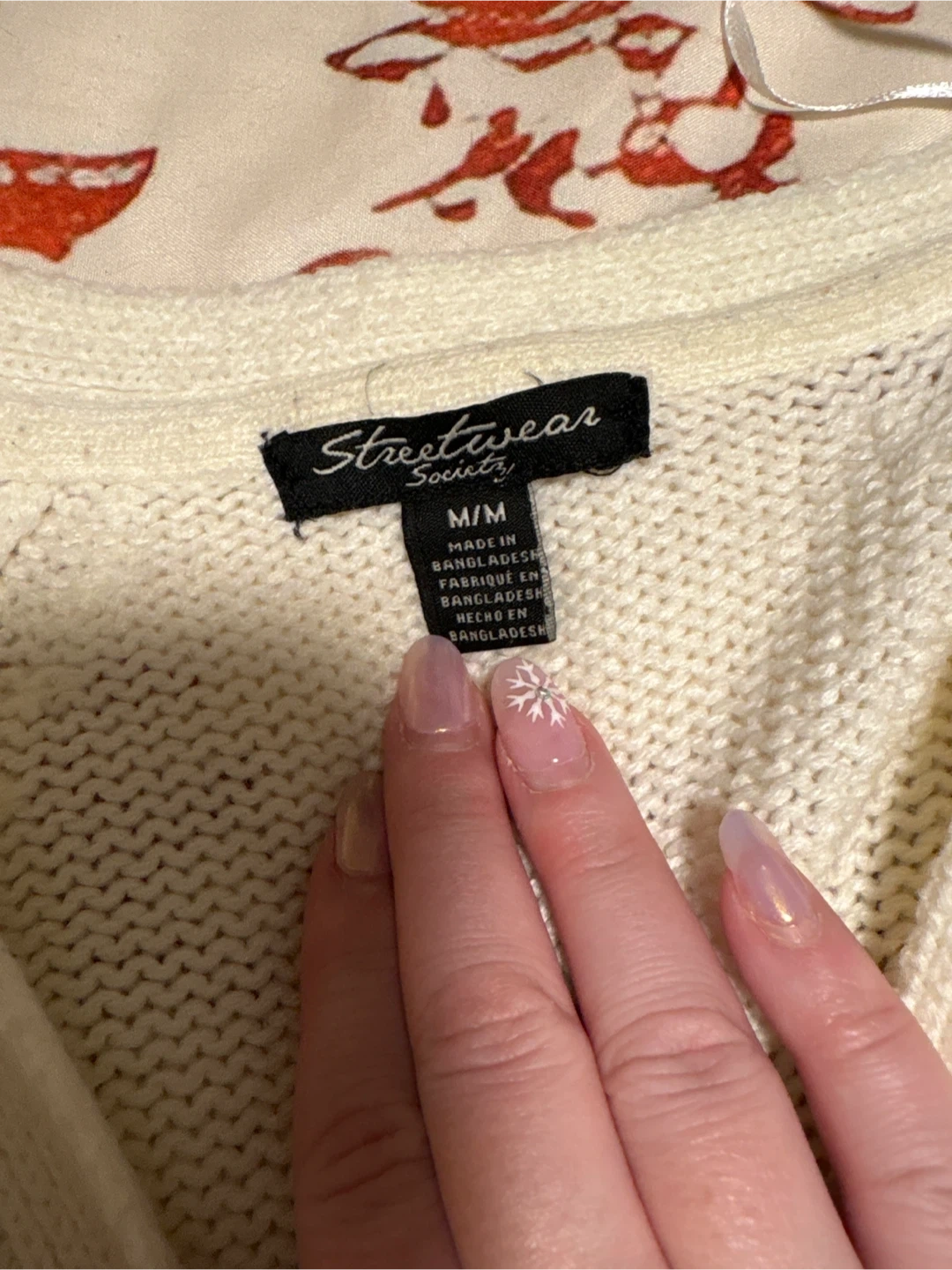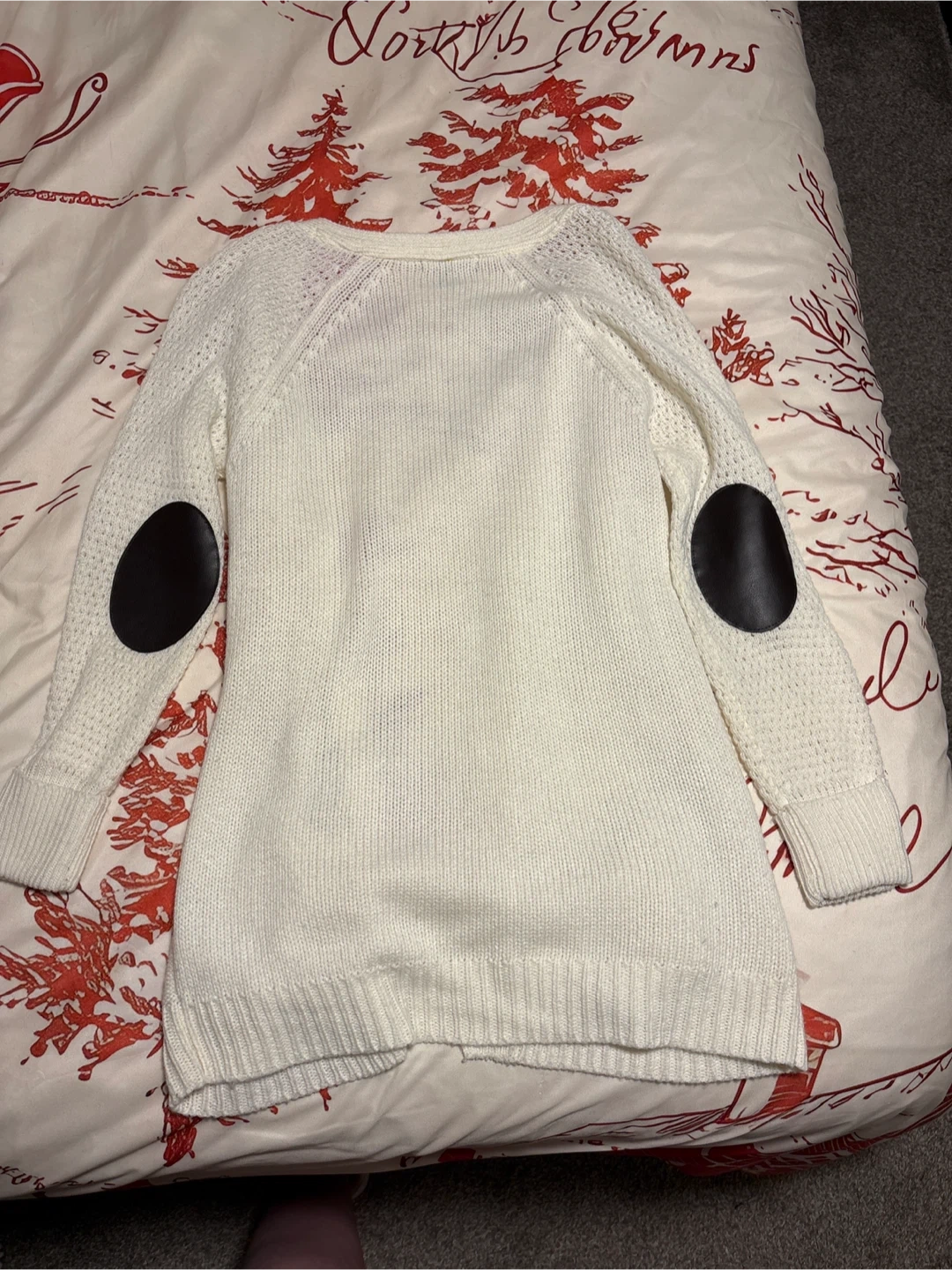 Selling a cozy Streetwear Society cardigan in size M/M. It's a cream colour with pleather accents on the elbows.