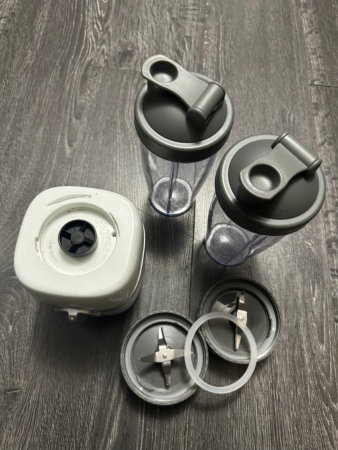 Two travel cups with lids, 2 blades,3 rubber rings,base and manual.