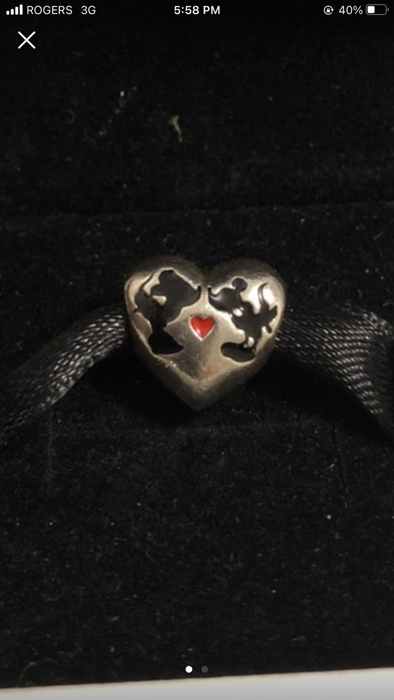 Silver charm in the shape of a heart. Features Mickey Mouse and Minnie Mouse and a red enamel heart.