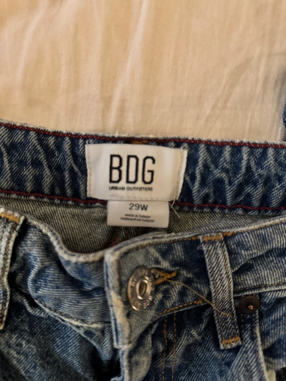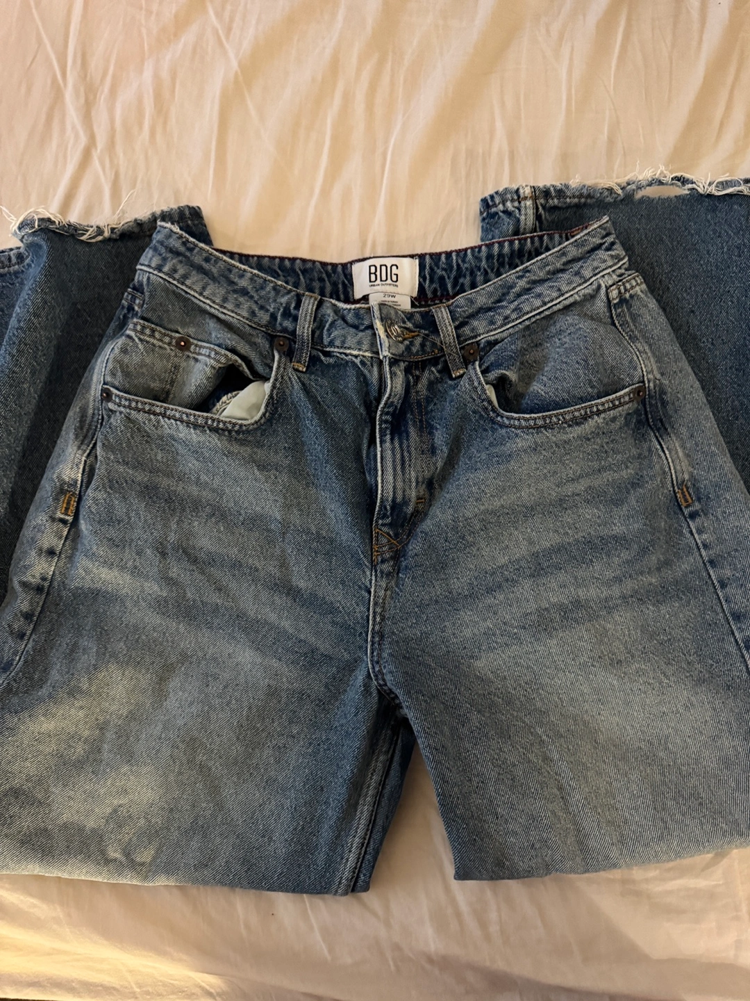 Baggy washed jeans A bit ripped on the ankle side, but not noticeable at all. Pick up King George or Surrey Cental