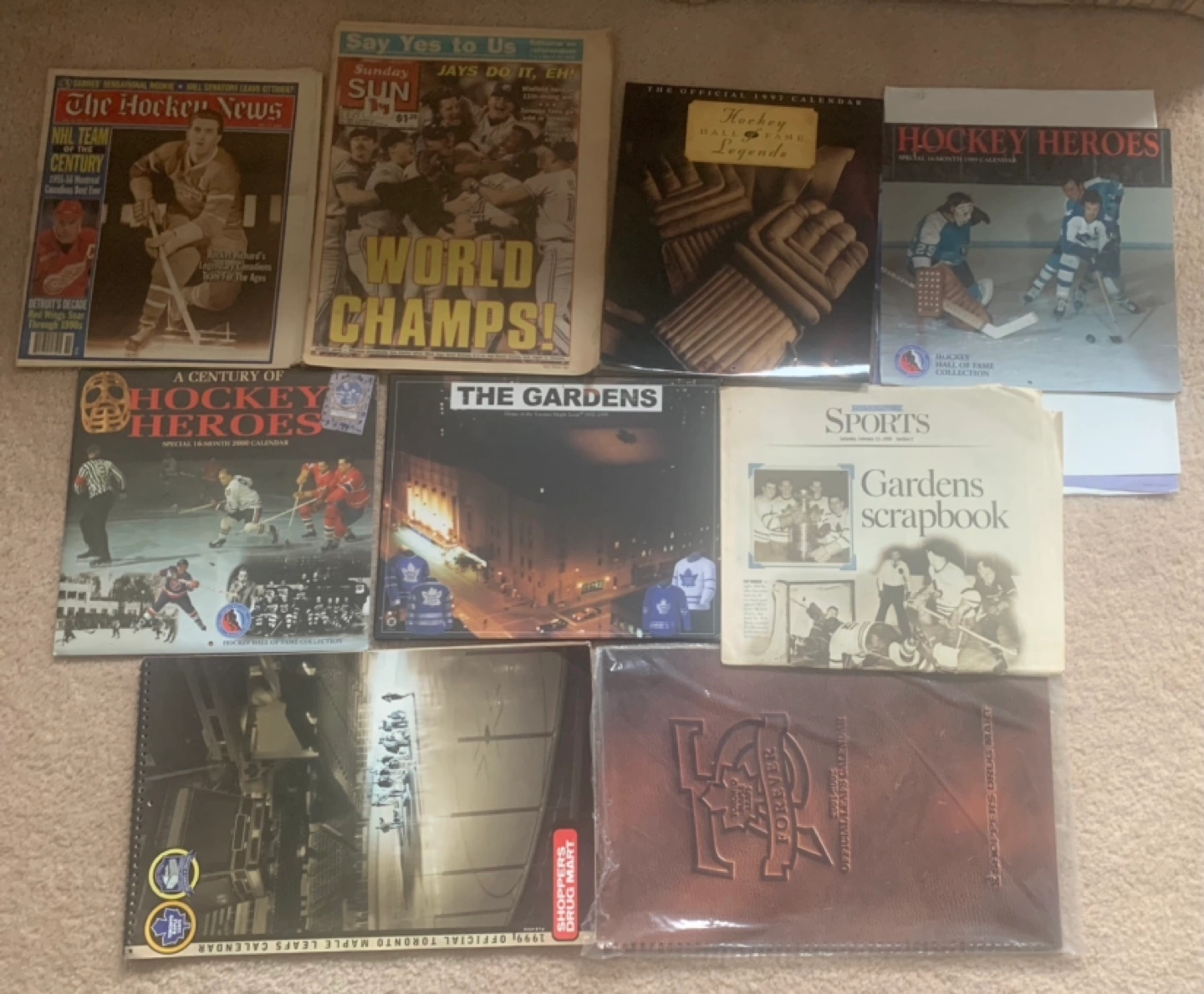 73Lot of various hockey memorabilia, includes calendars, newspapers, and a scrapbook. All items are in good condition. Also Maple Leaf Gardens Plaque Blue Jays and Maple π Leafs