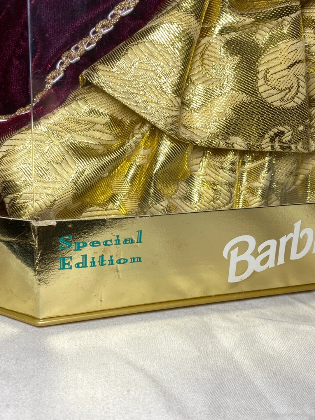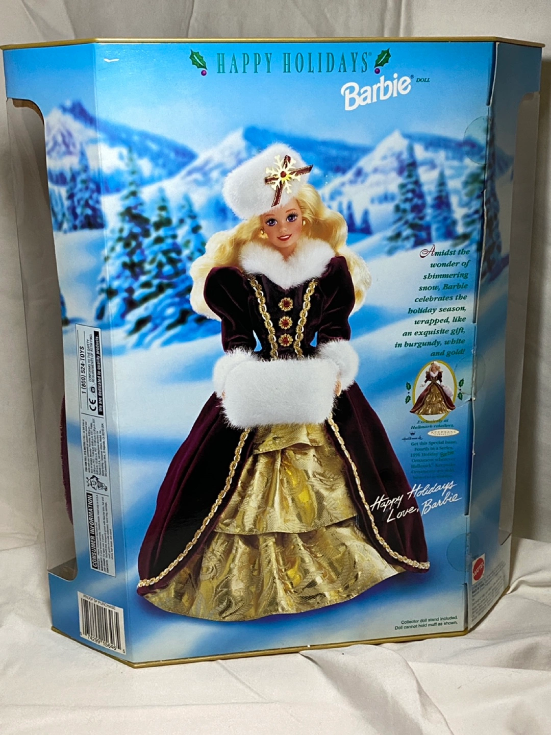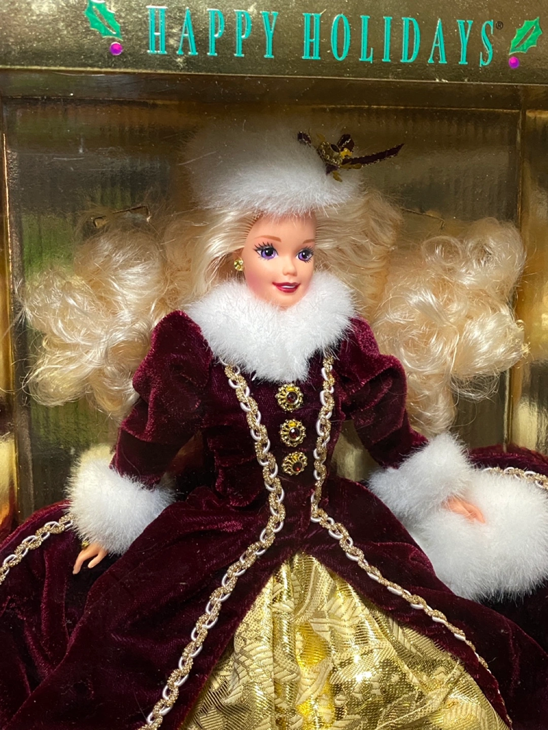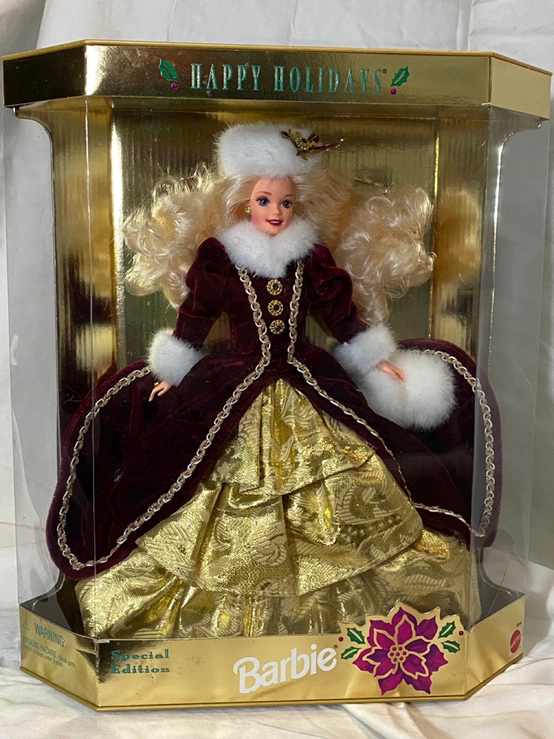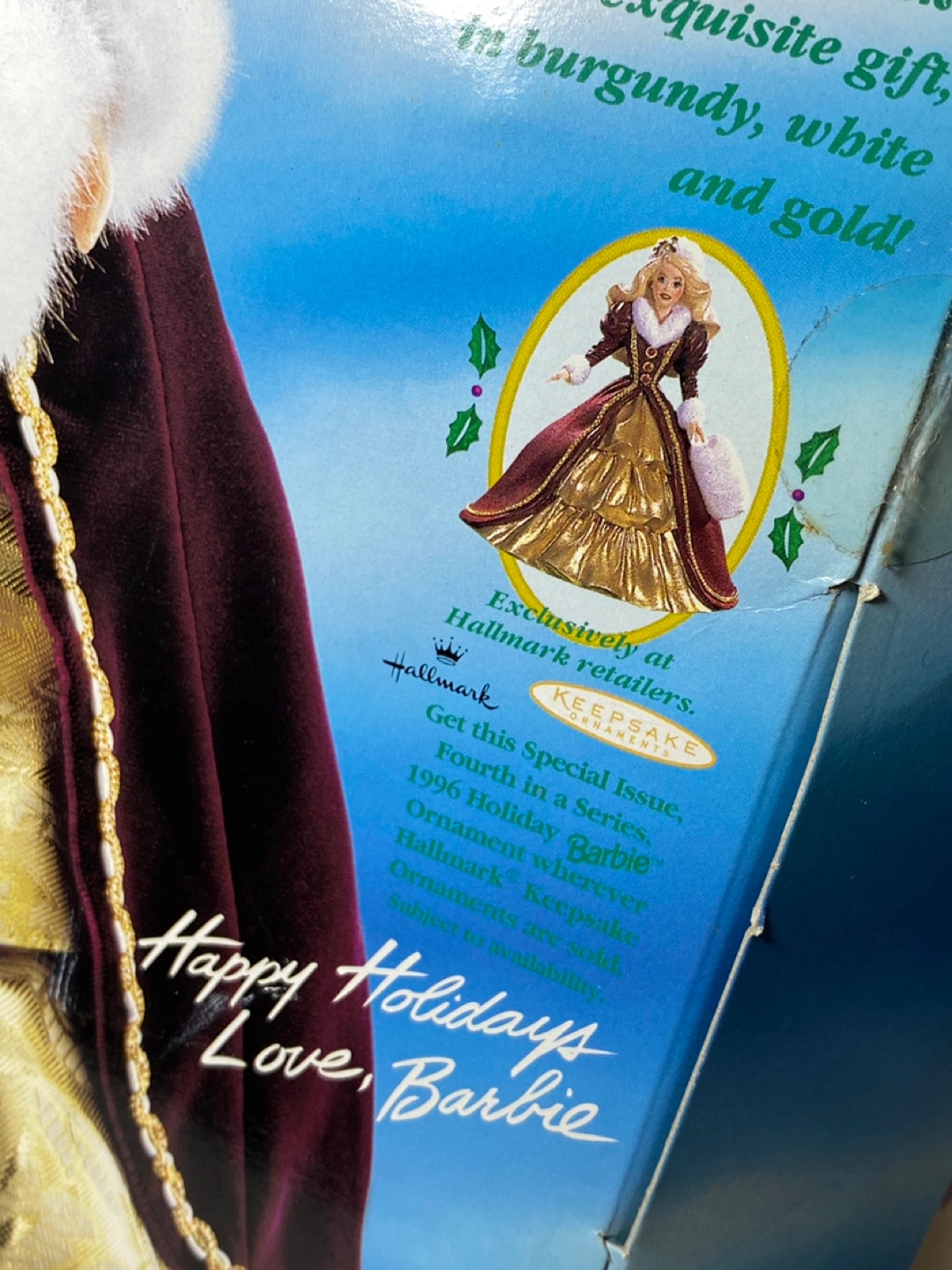 Special edition vintage Holiday Barbie doll in burgundy and gold dress, white fur trim. From 1996. Doll is in original box. Box is in fair condition, has some wear and tear. Cash preferred with pickup on Astoria Blvd South and 37th Street.