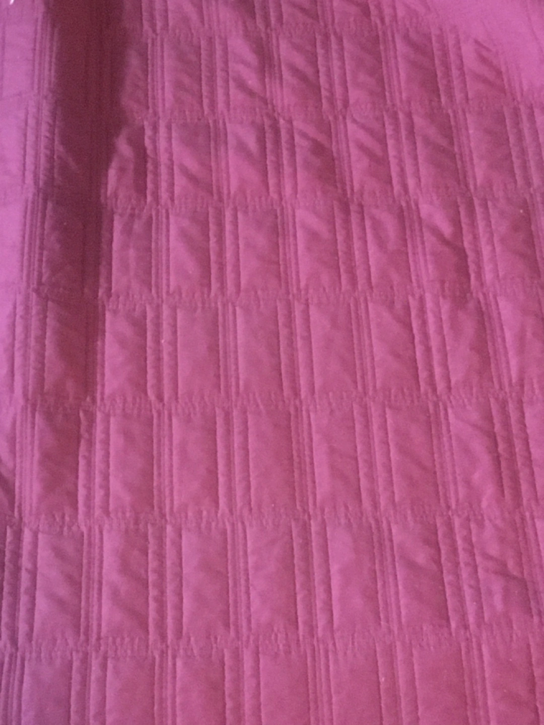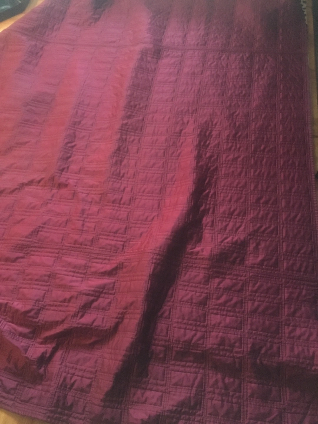 Burgundy quilted quilt / comforter. I feel like it could fit a king size mattress also. 1st pic is the top side which has a nice sheen to it but it shows more in the last 2 pics. 2nd pic is the underside which is not shiny and not meant to be the top. There are no stains or tears. If burgundy is your colour this looks nice and will keep you warm. Thx 😊