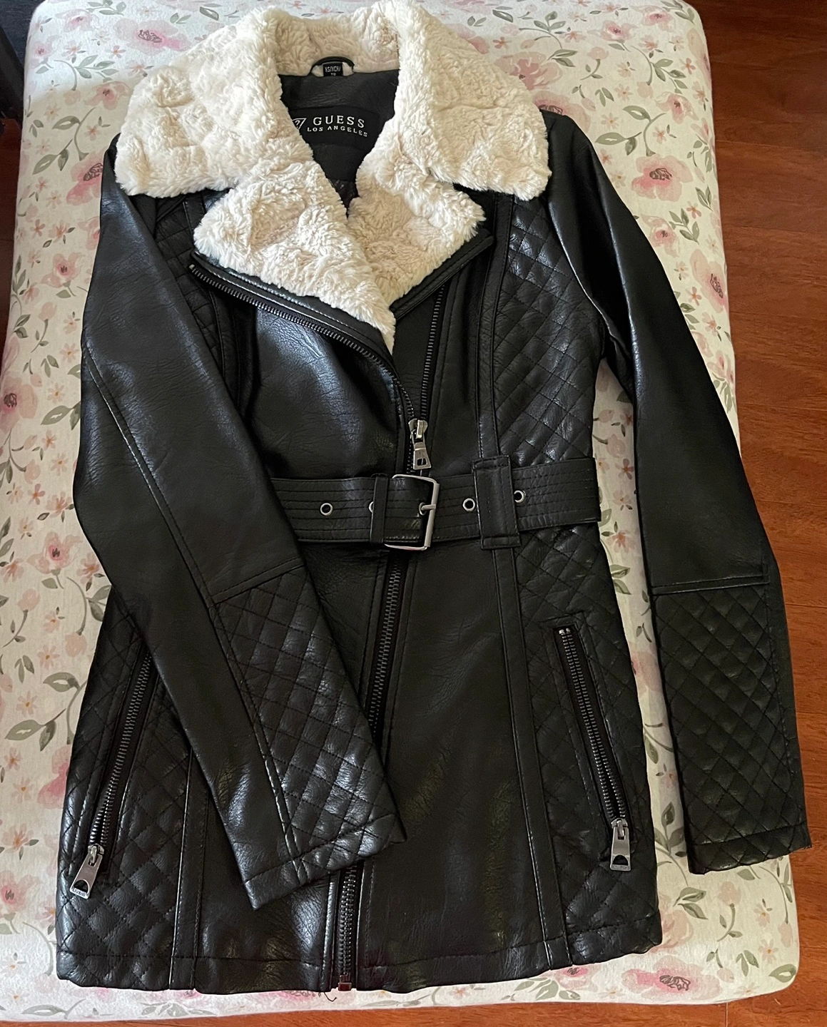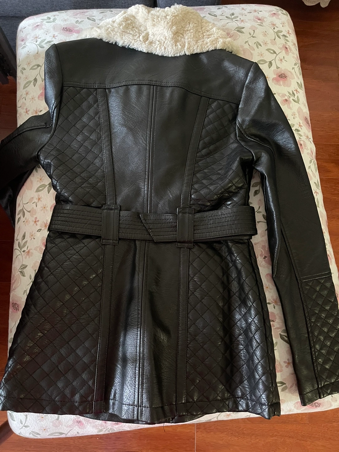 Black faux leather jacket with a faux fur collar and belt. Quilted design. Zip closure.