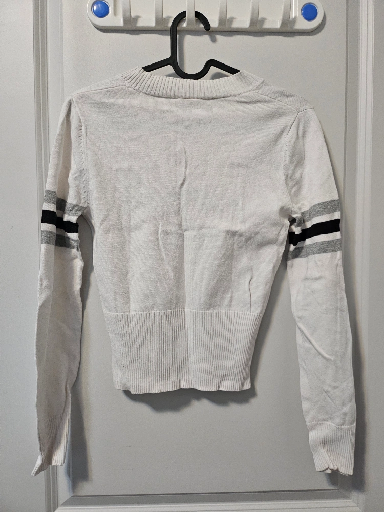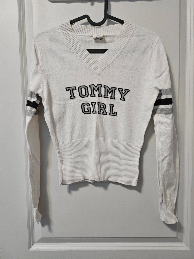 109White long-sleeve sweater with a V-neck and black and grey stripes on the sleeves. Tommy Girl logo on the front. women s size