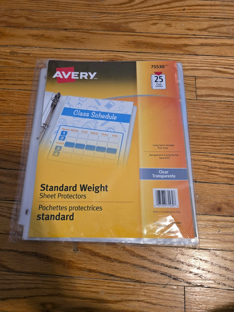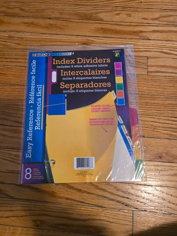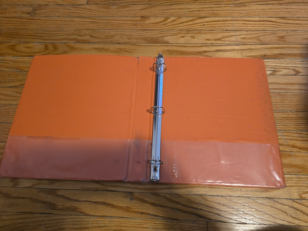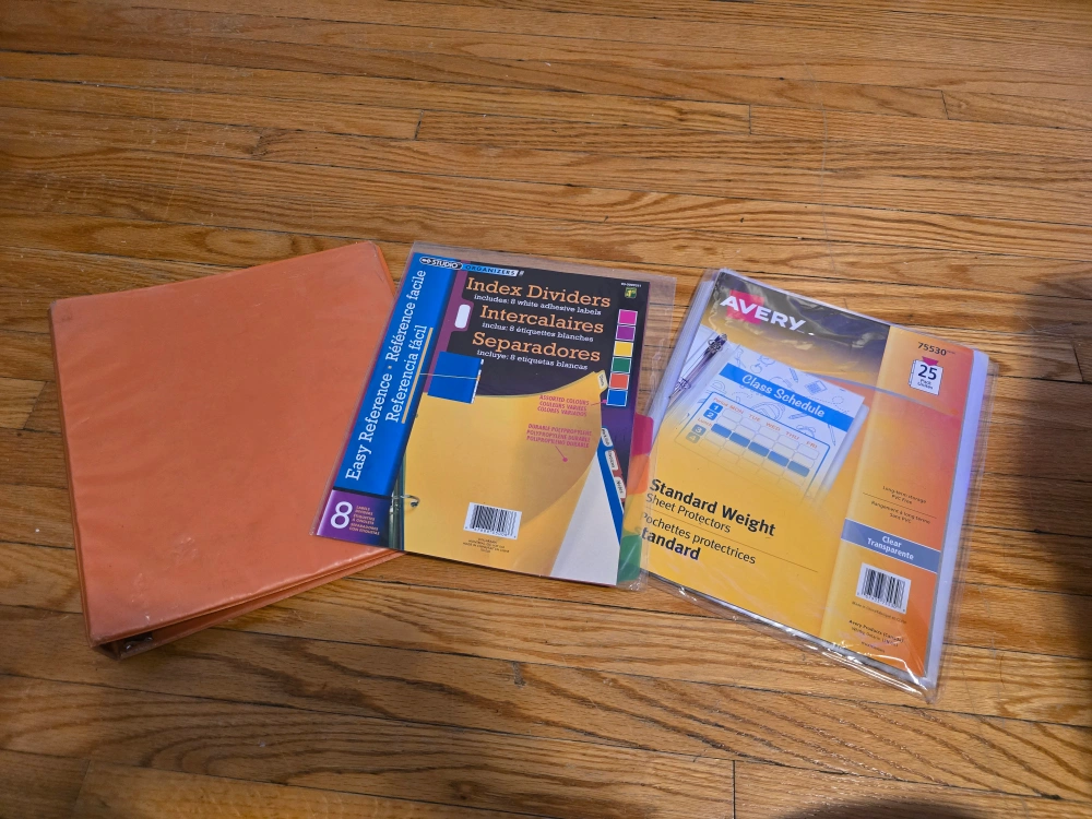 Orange 3-ring binder, includes index dividers and Avery sheet protectors.