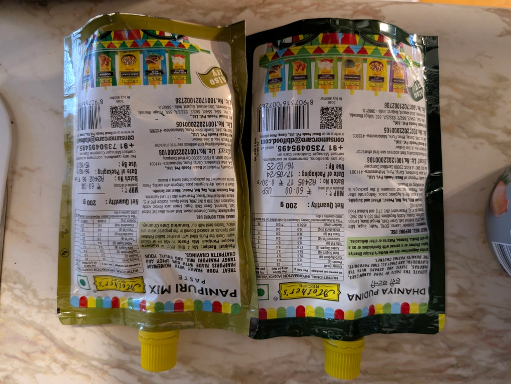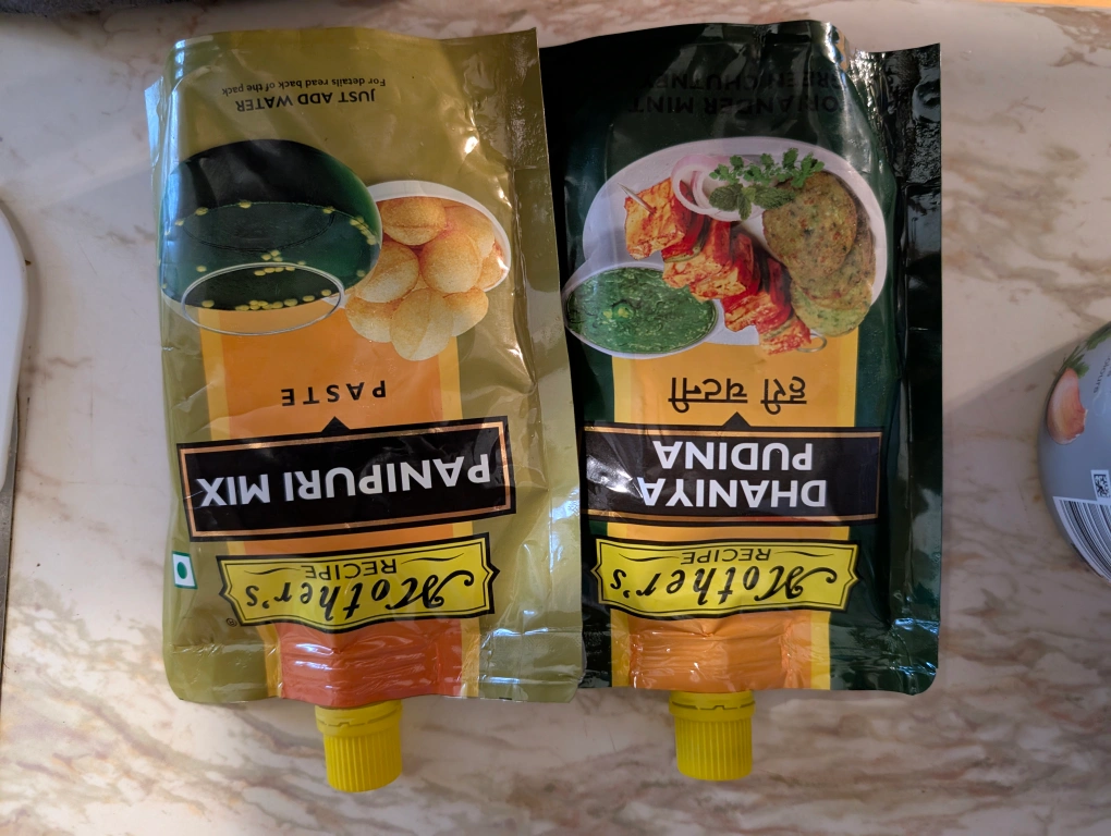 Two packets of Mother's Recipe food paste. One is Panipuri Mix and the other is Dhanya Pudina Paste. Instructions for use are on the back of the packets. I have way too many sent from India and the expiration date is in February 2025. They taste good with sandwiches, fried potatoes, and kebab as well