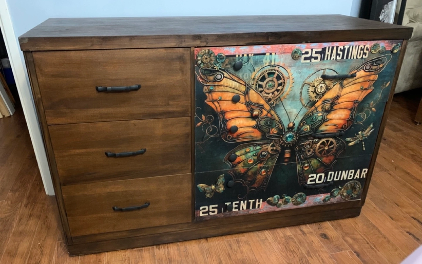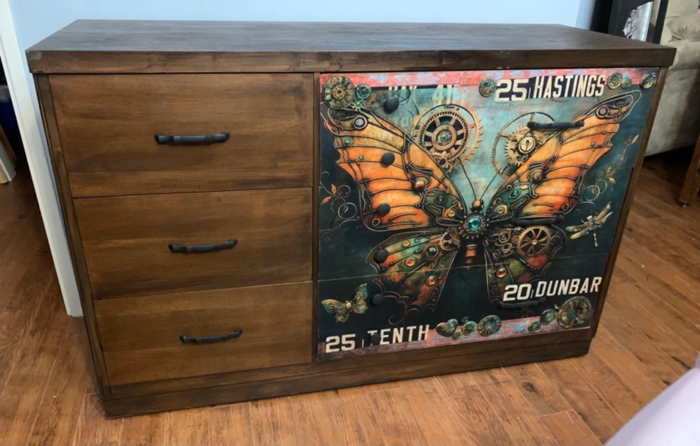 Wooden cabinet with 6 drawers. One side of drawers features a decorative steampunk butterfly design with gears, jewels, and metal accents. The cabinet has black metal drawer pulls.
