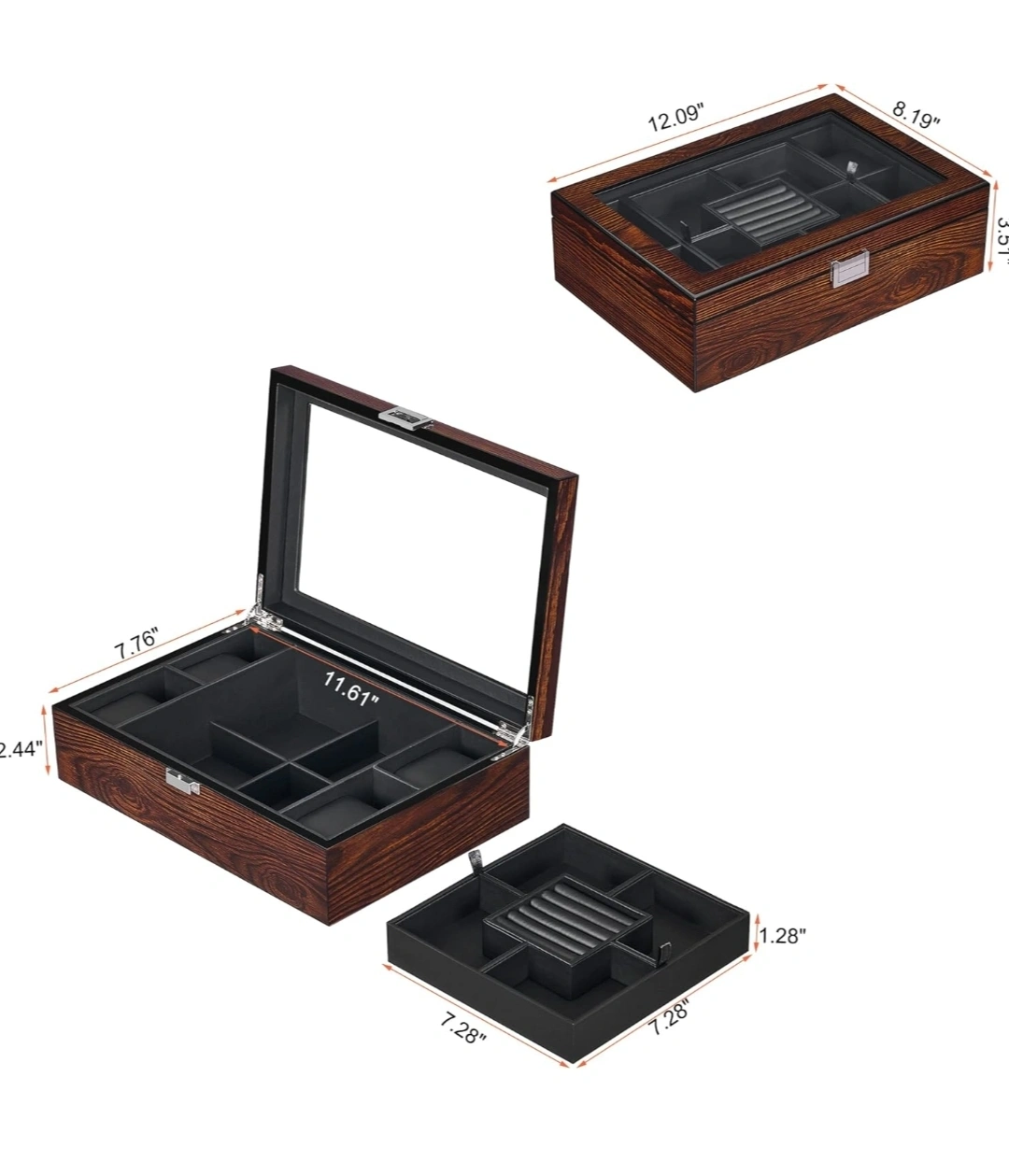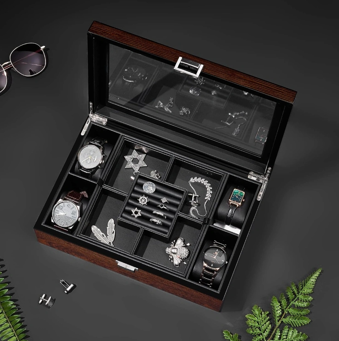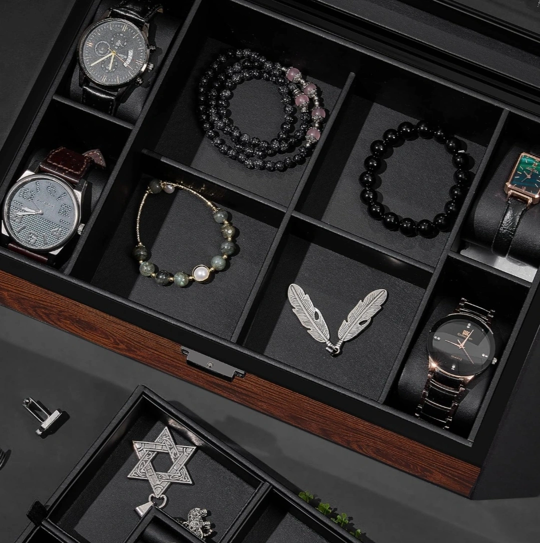 WATCH & JEWELRY COMBO ORGANIZER: This versatile box includes a removable tray for earrings, rings, cufflinks, and more. The lower compartment features four large slots for bracelets and four soft, removable pillows for watches, providing ample storage. Enjoy the convenience of keeping all your jewelry and accessories neatly organized and ready for daily use.