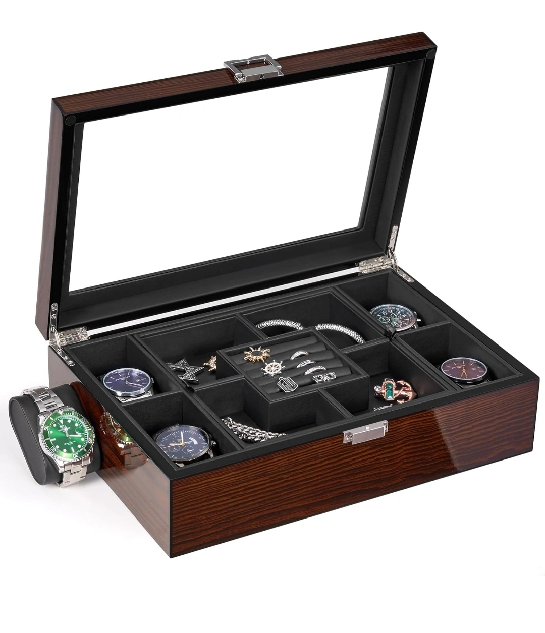 BEWISHOME Jewelry Box for Men with Glass Top, Wooden Watch Box