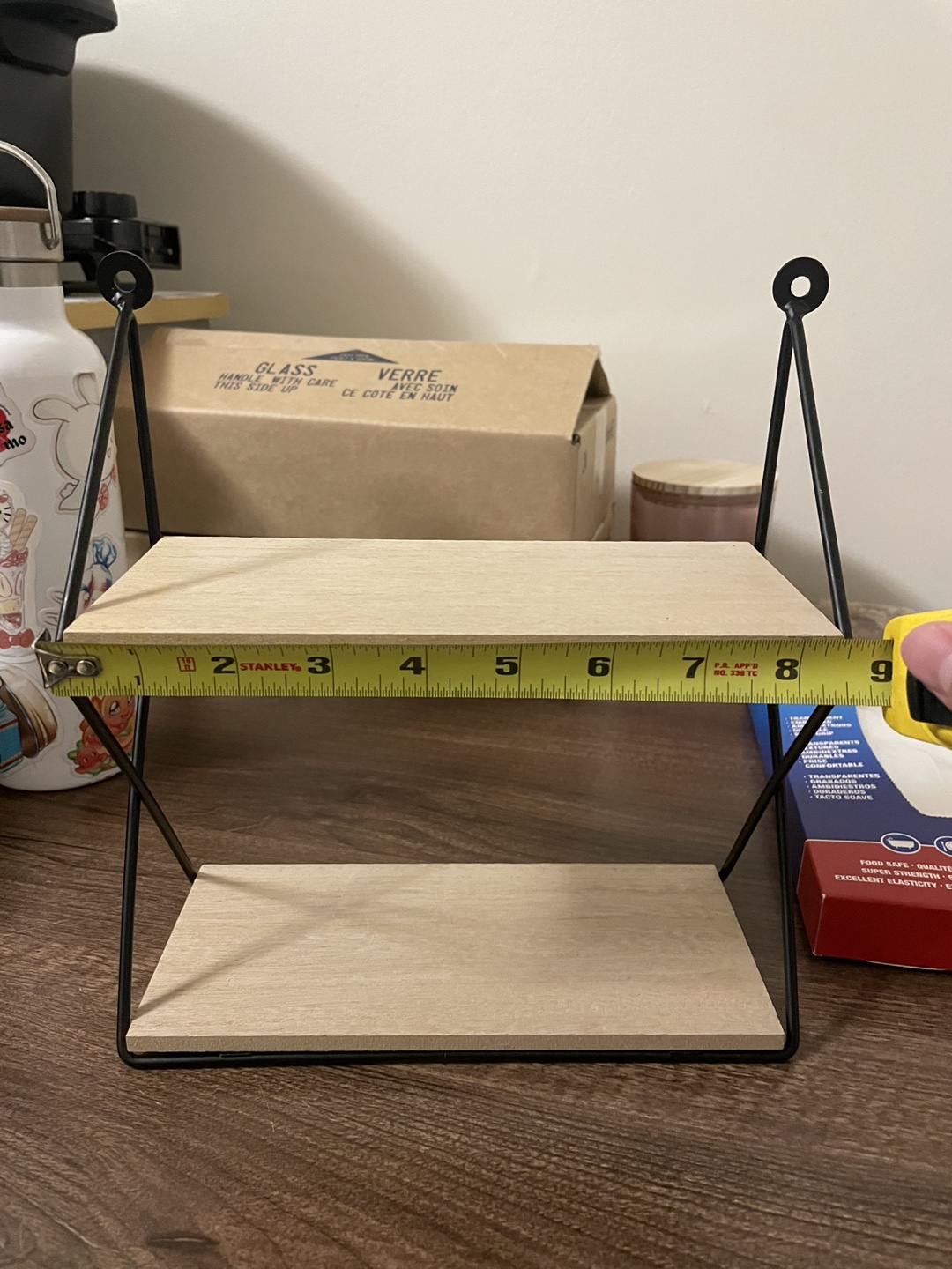 Small wall shelf with two tiers. Made of black metal and wood.