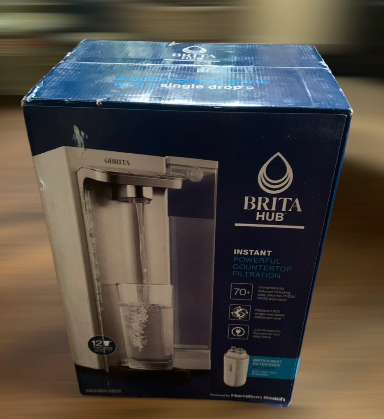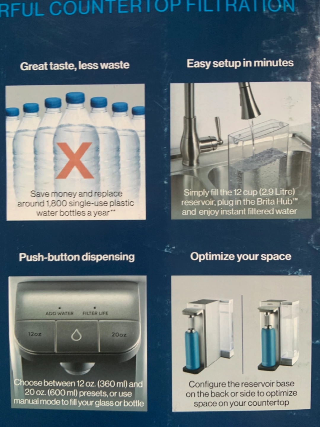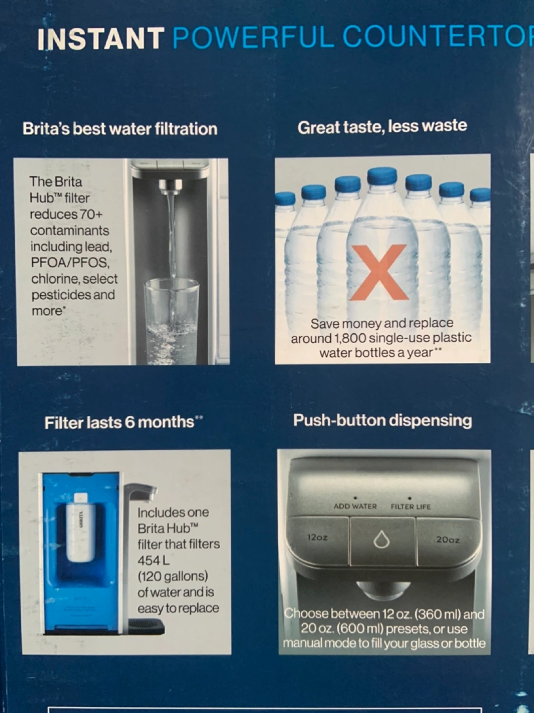 Countertop water filter, reduces 70+ contaminants, includes one filter, push-button dispensing, choose between 12 oz or 20 oz presets, or use manual mode to fill your glass or bottle. Brand New final sale.