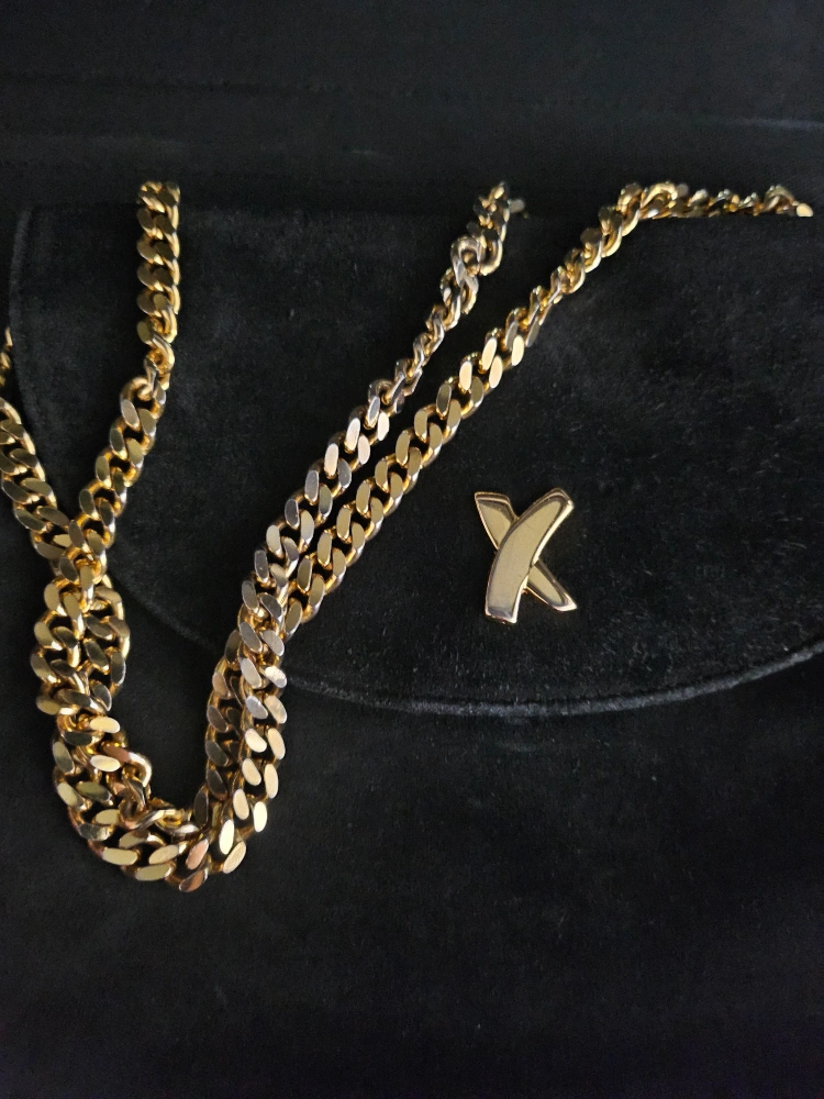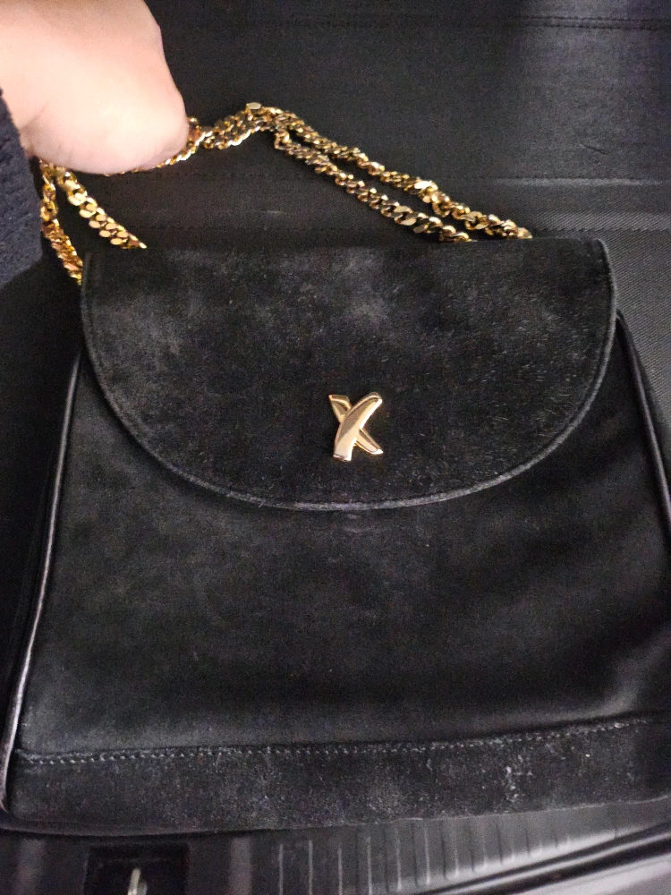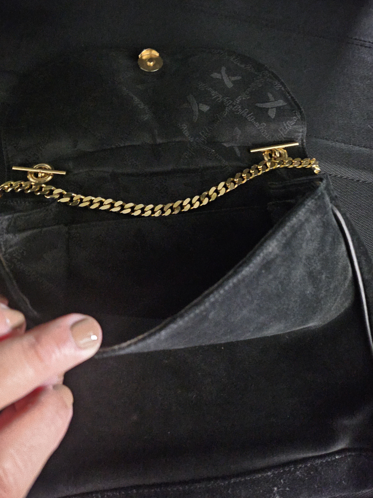 Black suede bag with gold chain strap and clasp. Interior lining is in good condition.
