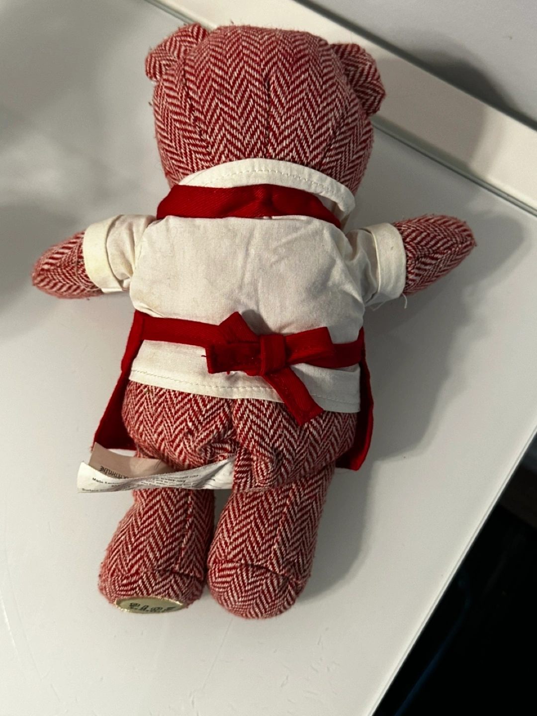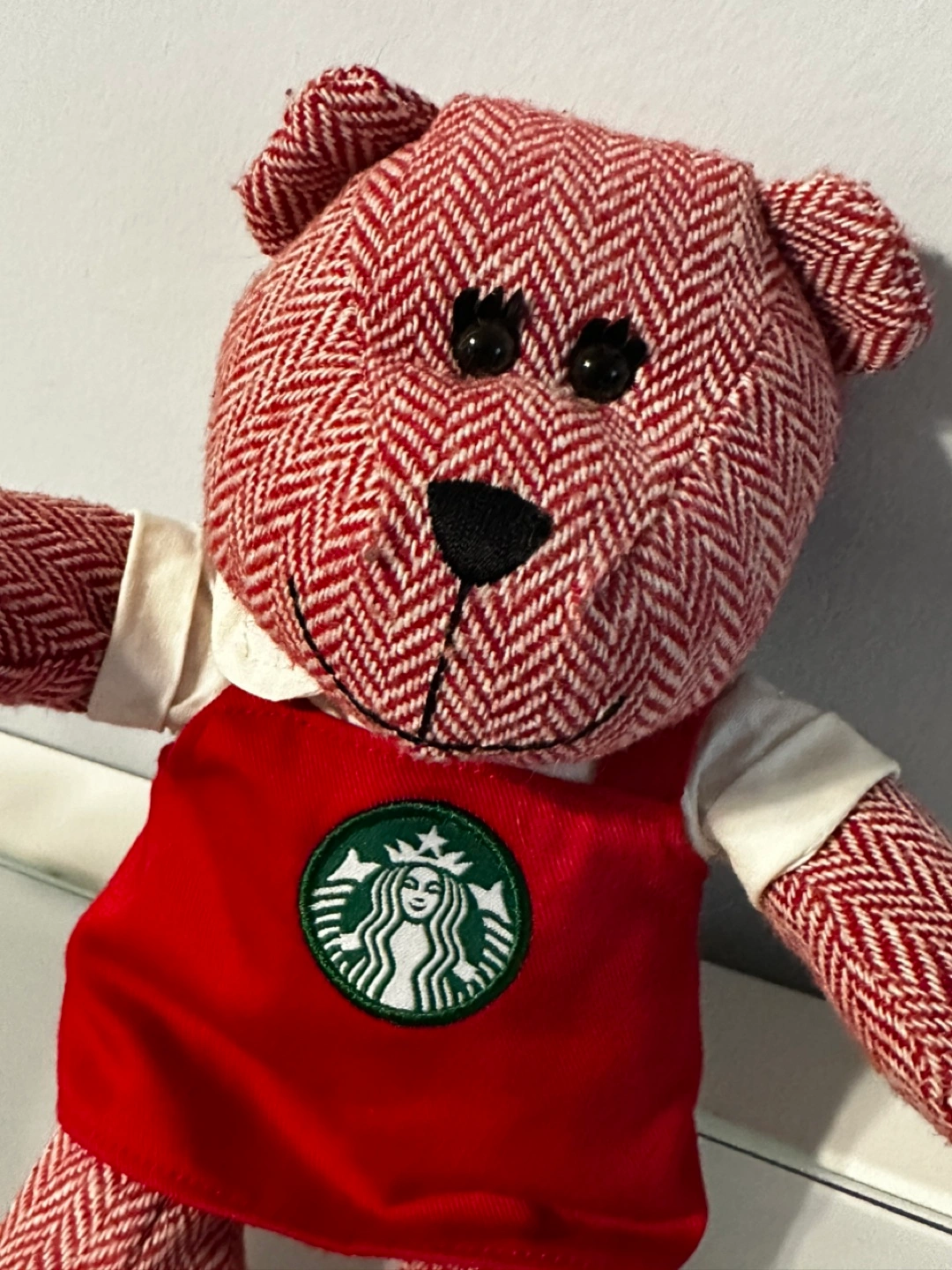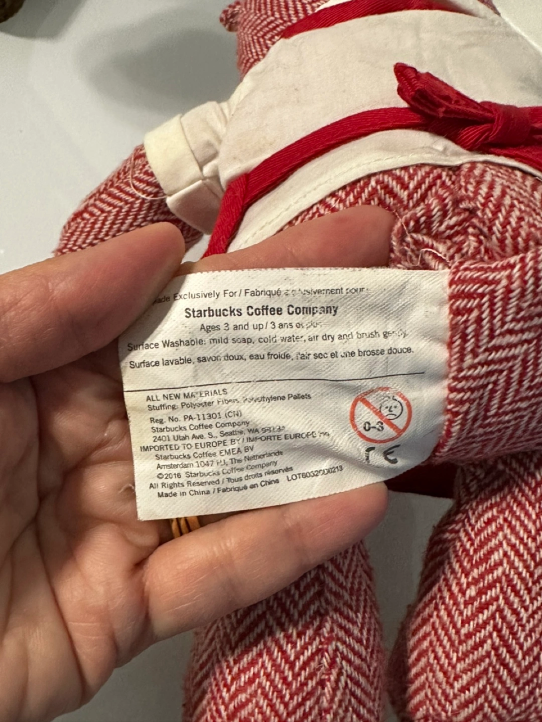 Red and white plush bear wearing a Starbucks apron. Has a 2016 Starbucks tag on the foot. Self pickup at Coquitlam Parkway Blvd