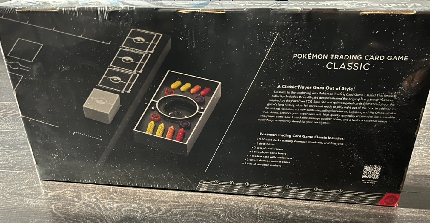 Sealed exclusive collection box that includes: - 3 60-card decks starring Venusaur, Charizard, and Blastoise - 3 deck boxes - 3 sets of card sleeves - 1 two-player game board - 1 toolbox case with randomizer - 2 sets of damage counter cones - 2 sets of condition markers This timeless collection includes three 60-card decks featuring the original first partner Pokémon inspired by the Base Set and quintessential cards from throughout the game’s long history.