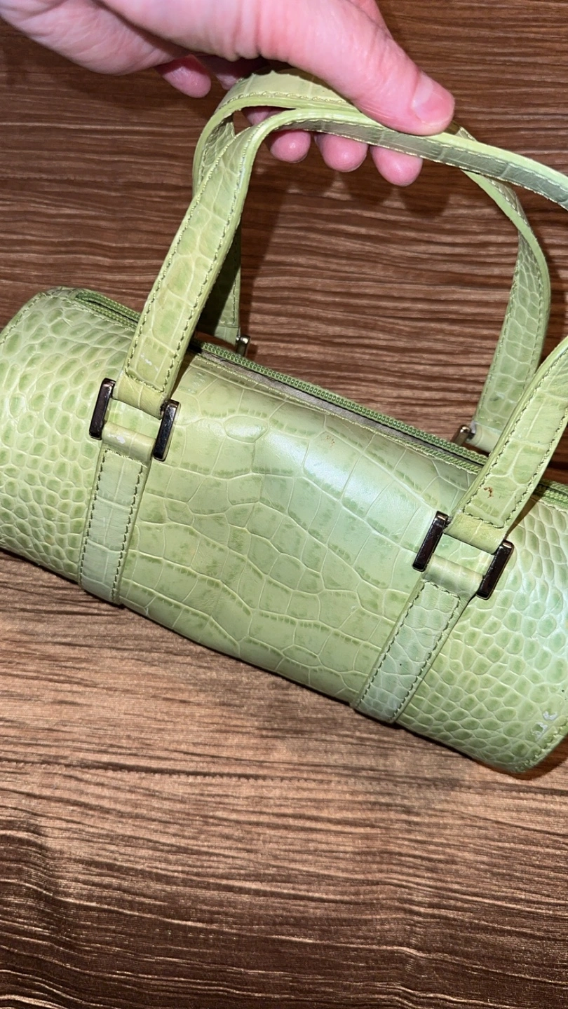 32Small green leather handbag with a zipper closure. Has a top handle.