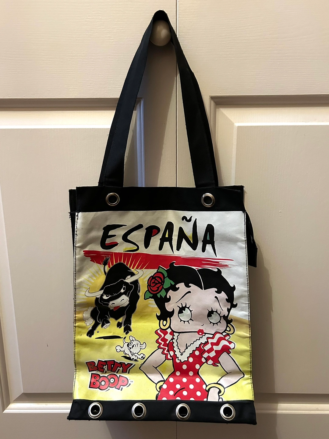 Black canvas tote bag with a Betty Boop design featuring a bull and the word España. The bag has two top handles and a zipper closure.
