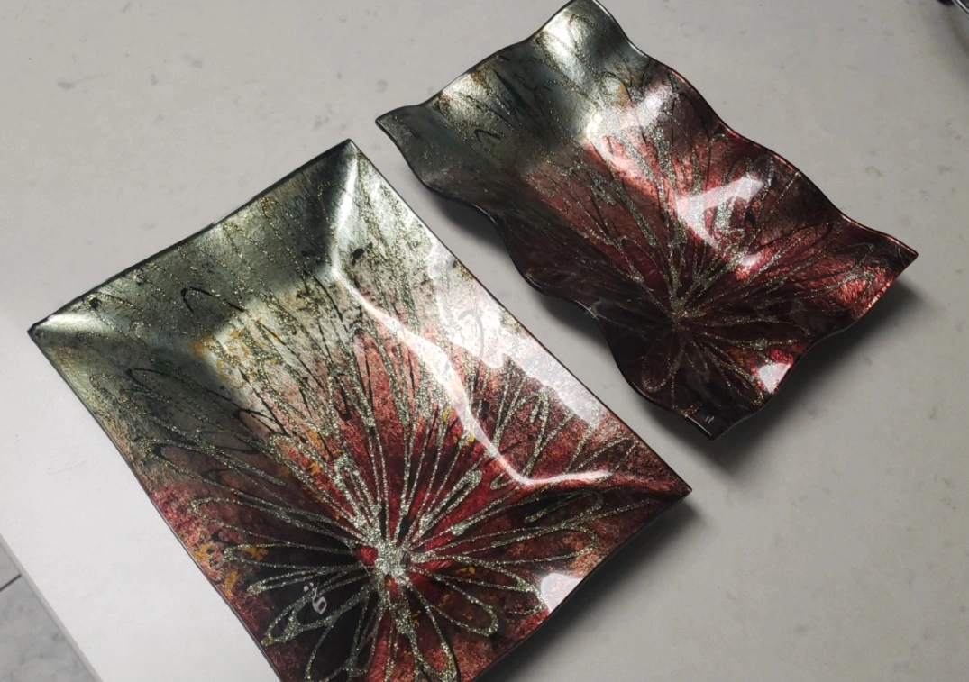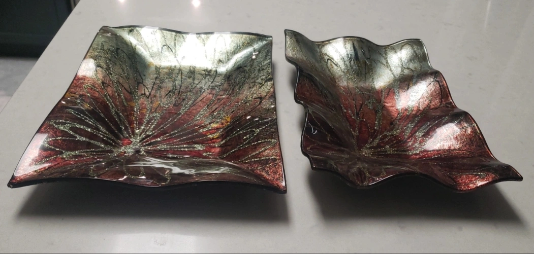 Brand new and handcrafted with foiled glass. A beautiful set of 6 plates, 8 coasters, and 2 serving platters.
