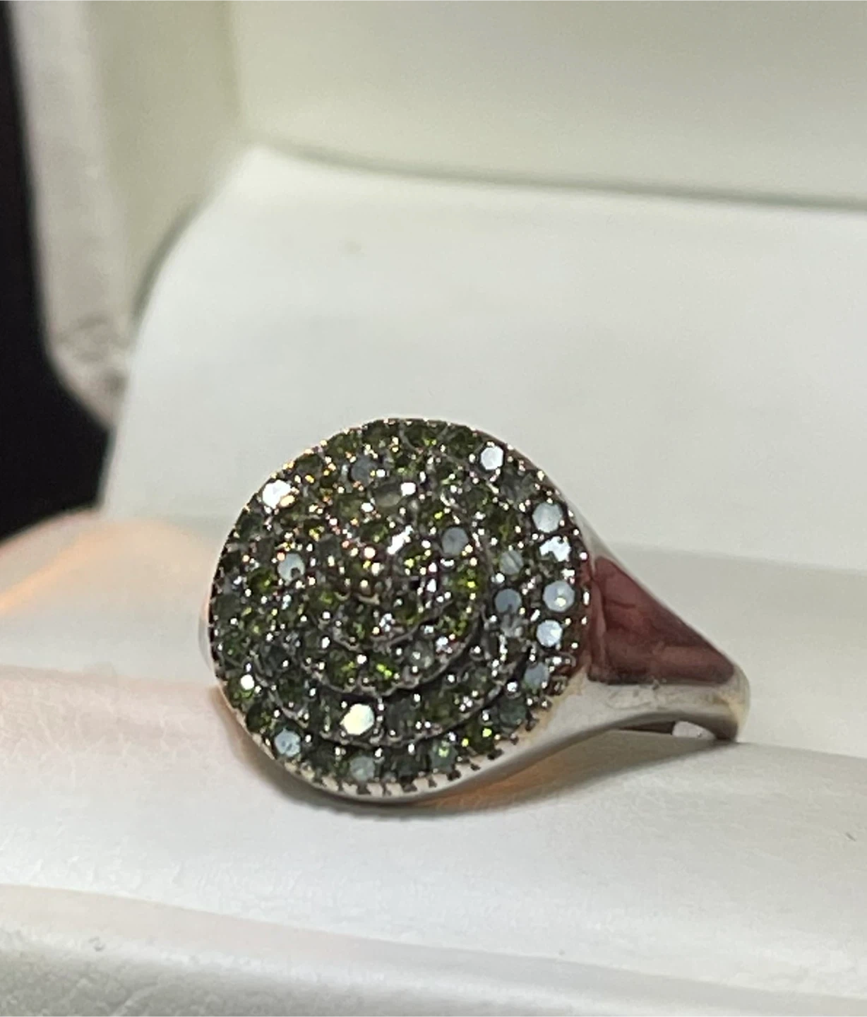 Selling a lovely 375 white gold ring adorned with sparkling green diamond’s It's New condition and ready to add a touch of elegance to your style!