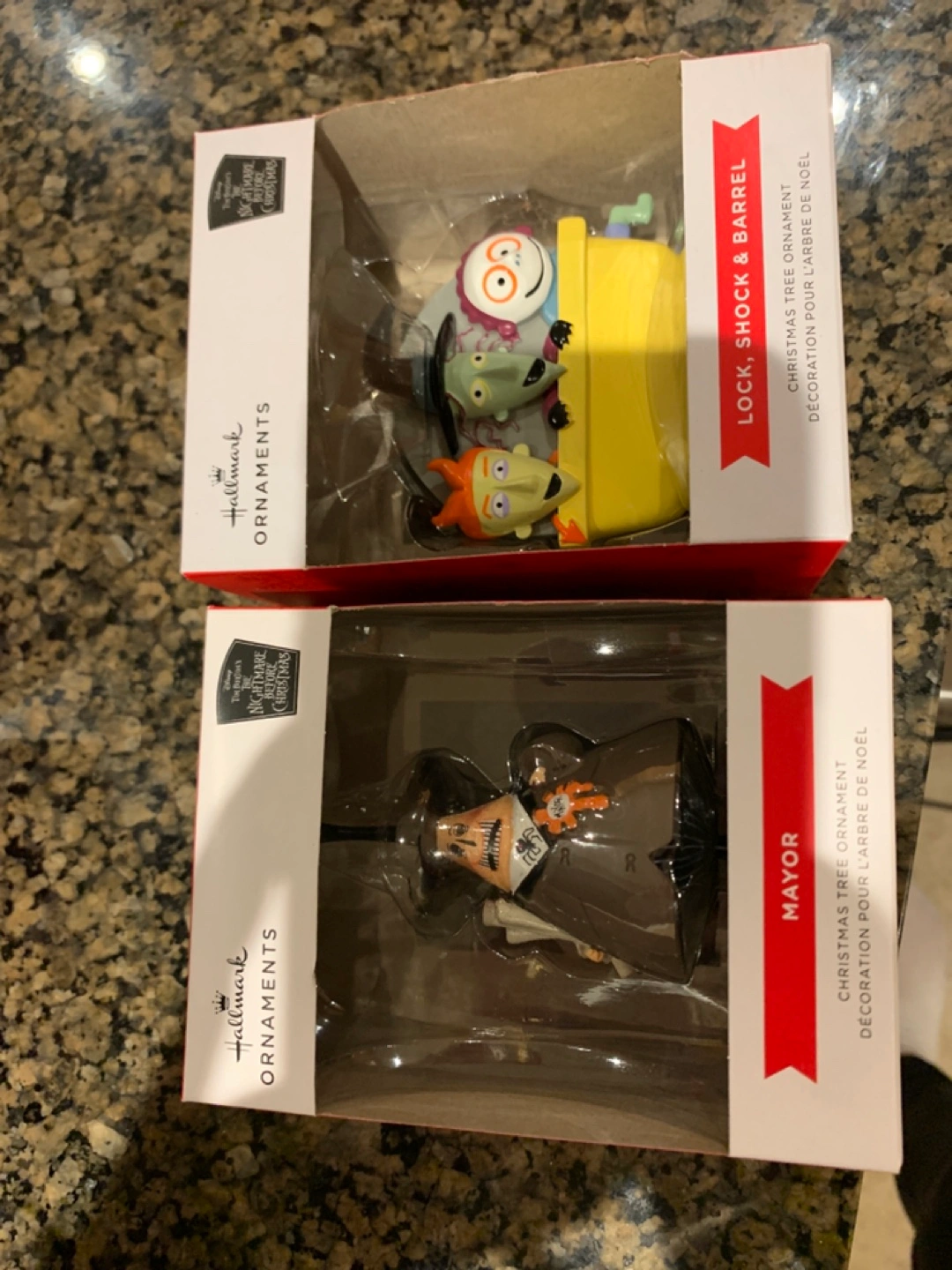 Two Nightmare Before Christmas Hallmark ornaments, one of Lock, Shock, and Barrel and the other of the Mayor.
